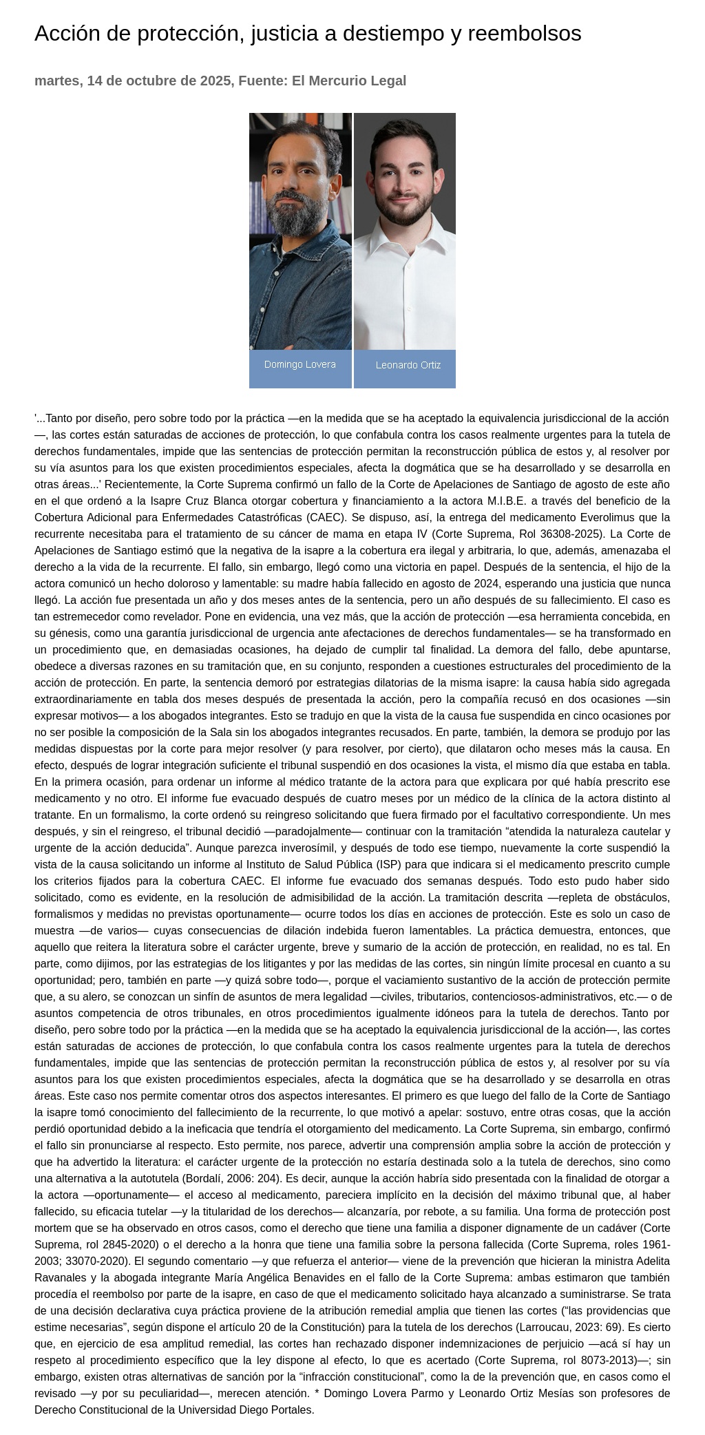 ".. .Tanto por diseño, pero sobre todo por la práctica —en la medida que se ha aceptado la equivalencia jurisdiccional de la acción—, las cortes están saturadas de acciones de protección, lo que confabula contra los casos realmente urgentes para la tutela de derechos fundamentales, impide que las sentencias de protección permitan la reconstrucción pública de estos y, al resolver por su vía asuntos para los que existen procedimientos especiales, afecta la dogmática que se ha desarrollado y se desarrolla en otras áreas.. ." Recientemente, la Corte Suprema confirmó un fallo de la Corte de Apelaciones de Santiago de agosto de este año en el que ordenó a la Isapre Cruz Blanca otorgar cobertura y financiamiento a la actora M.I.B.E. a través del beneficio de la Cobertura Adicional para Enfermedades Catastróficas (CAEC). Se dispuso, así, la entrega del medicamento Everolimus que la recurrente necesitaba para el tratamiento de su cáncer de mama en etapa IV (Corte Suprema, Rol 36308-2025). La Corte de Apelaciones de Santiago estimó que la negativa de la isapre a la cobertura era ilegal y arbitraria, lo que, además, amenazaba el derecho a la vida de la recurrente. El fallo, sin embargo, llegó como una victoria en papel. Después de la sentencia, el hijo de la actora comunicó un hecho doloroso y lamentable: su madre había fallecido en agosto de 2024, esperando una justicia que nunca llegó. La acción fue presentada un año y dos meses antes de la sentencia, pero un año después de su fallecimiento. El caso es tan estremecedor como revelador.