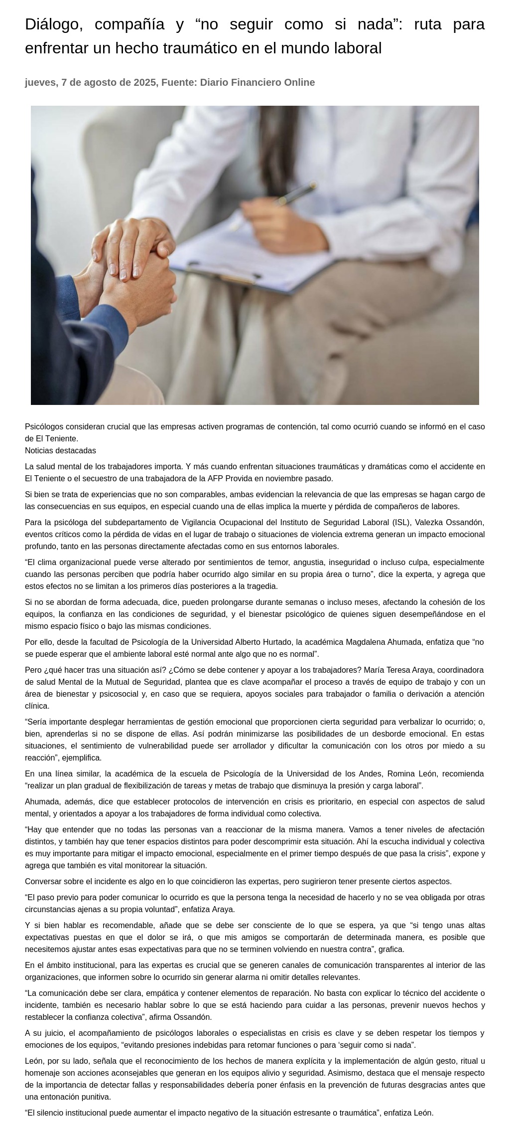 Diálogo, compañía y “no seguir como si nada”: ruta para enfrentar un hecho traumático en el mundo laboral 07-08-2025 Diario Financiero Online Psicólogos consideran crucial que las empresas activen programas de contención, tal como ocurrió cuando se informó en el caso de El Teniente. Noticias destacadas La salud mental de los ... |