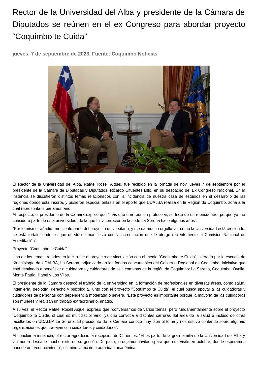 Rector de la Universidad del Alba y presidente de la Cámara de Diputados se reúnen en el ex Congreso para abordar proyecto “Coquimbo te Cuida” 07-09-2023 Coquimbo Noticias El Rector de la Universidad del Alba, Rafael Rosell Aiquel, fue recibido en la jornada de hoy jueves 7 de septiembre por el presidente de la Cámara de Diputadas y Diputados, Ricardo Cifuentes Lill... |