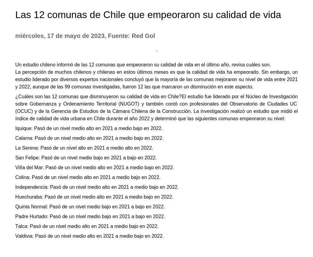 Las 12 comunas de Chile que empeoraron su calidad de vida 17-05-2023 Red Gol Un estudio chileno informó de las 12 comunas que empeoraron su calidad de vida en el último año, revisa cuáles son. La percepción de muchos chilenos y chilenas en estos últimos meses es que la c... |