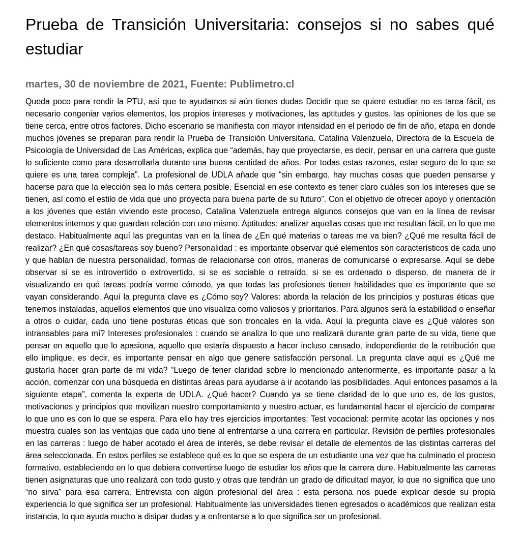Queda poco para rendir la PTU, así que te ayudamos si aún tienes dudas Decidir que se quiere estudiar no es tarea fácil, es necesario congeniar varios elementos, los propios intereses y motivaciones, las aptitudes y gustos, las opiniones de los que se tiene cerca, entre otros factores., Intereses profesionales : cuando se analiza lo que uno realizará durante gran parte de su vida, tiene que pensar en aquello que lo apasiona, aquello que estaría dispuesto a hacer incluso cansado, independiente de la retribución que ello implique, es decir, es importante pensar en algo que genere satisfacción personal., Revisión de perfiles profesionales en las carreras : luego de haber acotado el área de interés, se debe revisar el detalle de elementos de las distintas carreras del área seleccionada.