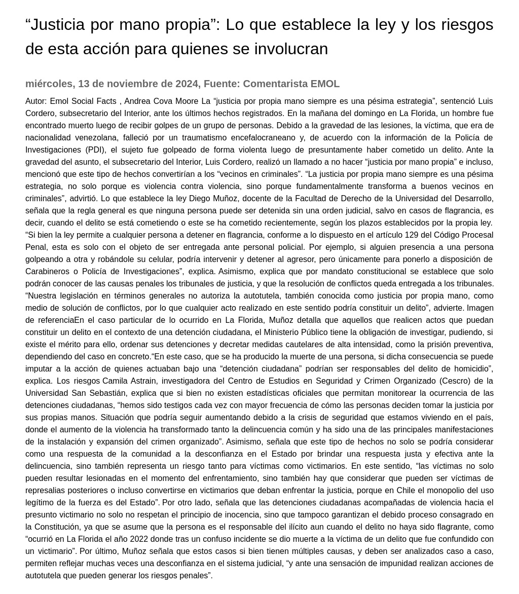 En este sentido, “las víctimas no solo pueden resultar lesionadas en el momento del enfrentamiento, sino también hay que considerar que pueden ser víctimas de represalias posteriores o incluso convertirse en victimarios que deban enfrentar la justicia, porque en Chile el monopolio del uso legítimo de la fuerza es del Estado”. Por otro lado, señala que las detenciones ciudadanas acompañadas de violencia hacia el presunto victimario no solo no respetan el principio de inocencia, sino que tampoco garantizan el debido proceso consagrado en la Constitución, ya que se asume que la persona es el responsable del ilícito aun cuando el delito no haya sido flagrante, como “ocurrió en La Florida el año 2022 donde tras un confuso incidente se dio muerte a la víctima de un delito que fue confundido con un victimario”. Por último, Muñoz señala que estos casos si bien tienen múltiples causas, y deben ser analizados caso a caso, permiten reflejar muchas veces una desconfianza en el sistema judicial, “y ante una sensación de impunidad realizan acciones de autotutela que pueden generar los riesgos penales”.