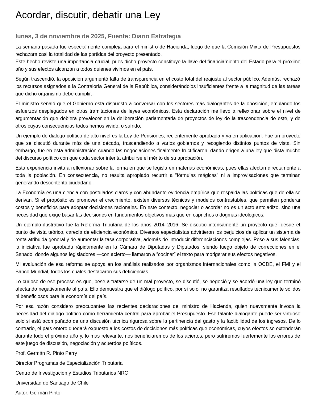 Acordar, discutir, debatir una Ley 03-11-2025 Diario Estrategia La semana pasada fue especialmente compleja para el ministro de Hacienda, luego de que la Comisión Mixta de Presupuestos rechazara casi la totalidad de las partidas del proyecto presentado. Este... |