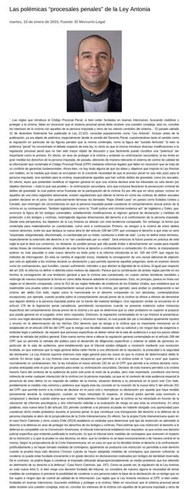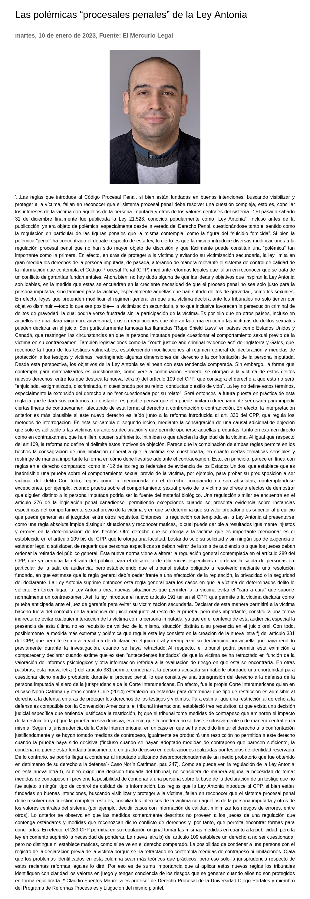 ".. .Las reglas que introduce al Código Procesal Penal, si bien están fundadas en buenas intenciones, buscando visibilizar y proteger a la víctima, fallan en reconocer que el sistema procesal penal debe resolver una cuestión compleja, esto es, conciliar los intereses de la víctima con aquellos de la persona imputada y otros de los valores centrales del sistema.. ." El pasado sábado 31 de diciembre finalmente fue publicada la Ley 21.523, conocida popularmente como “Ley Antonia”. Incluso antes de la publicación, ya era objeto de polémica, especialmente desde la vereda del Derecho Penal, cuestionándose tanto el sentido como la regulación en particular de las figuras penales que la misma contempla, como la figura del “suicidio femicida”. Si bien la polémica “penal” ha concentrado el debate respecto de esta ley, lo cierto es que la misma introduce diversas modificaciones a la regulación procesal penal que no han sido mayor objeto de discusión y que fácilmente puede constituir una “polémica” tan importante como la primera.