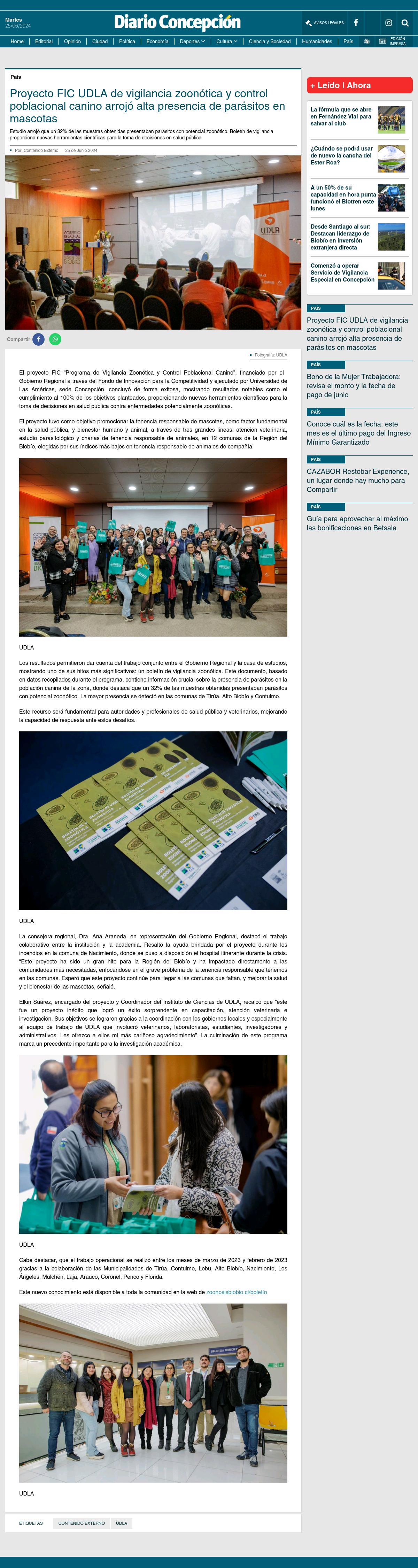 Proyecto FIC UDLA de vigilancia zoonótica y control poblacional canino arrojó alta presencia de parásitos en mascotas 25-06-2024 Diario Concepcion Estudio arrojó que un 32% de las muestras obtenidas presentaban parásitos con potencial zoonótico. Boletín de vigilancia proporciona nuevas herramientas científicas para la toma de decisiones en s... |