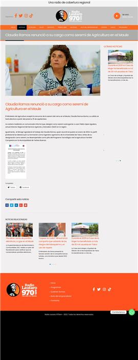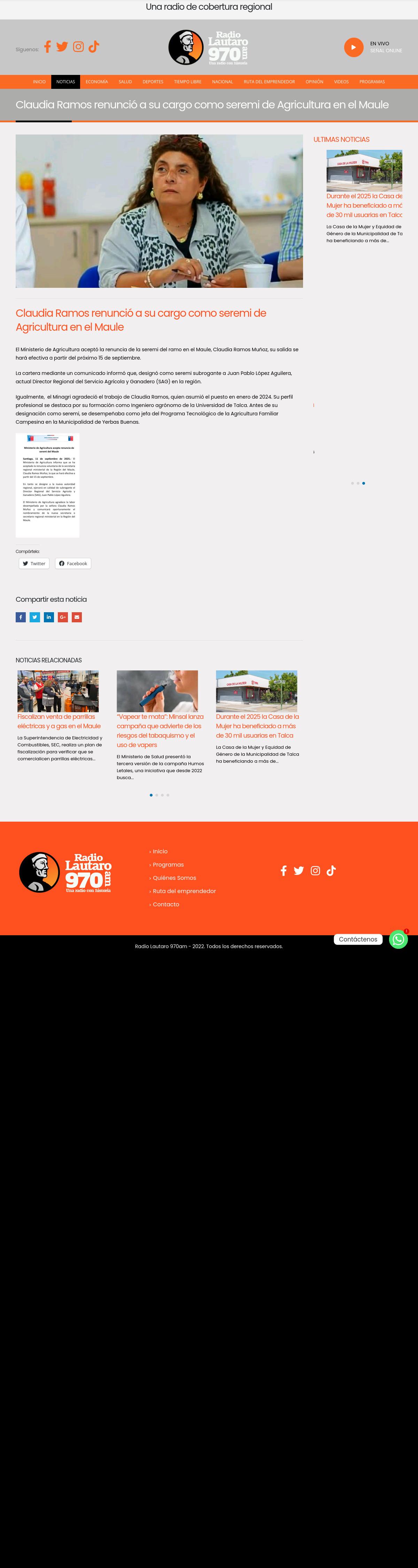 Claudia Ramos renunció a su cargo como seremi de Agricultura en el Maule 12-09-2025 radiolautarotalca.cl El Ministerio de Agricultura aceptó la renuncia de la seremi del ramo en el Maule, Claudia Ramos Muñoz, su salida se hará efectiva a partir del próximo 15 de septiembre. La cartera mediante un... |
