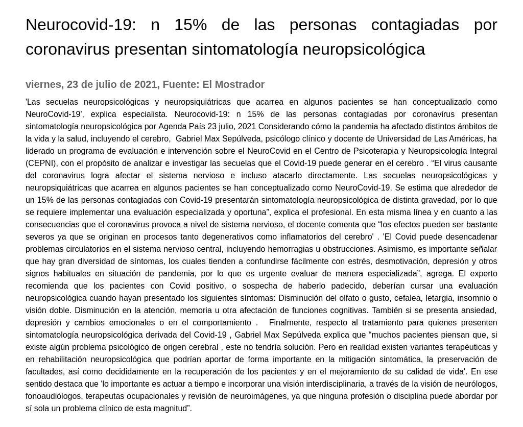 Neurocovid-19: n 15% de las personas contagiadas por coronavirus presentan sintomatología neuropsicológica 23-07-2021 El Mostrador "Las secuelas neuropsicológicas y neuropsiquiátricas que acarrea en algunos pacientes se han conceptualizado como NeuroCovid-19", explica especialista. Neurocovid-19: n 15% de las personas contag... |