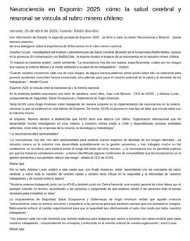 Neurociencia en Expomin 2025: cómo la salud cerebral y neuronal se vincula al rubro minero chileno 25-04-2025 Radio Bio-Bio Con información de Durante la segunda jornada de Expomin 2025, se llevó a cabo la charla “Neurociencia y Minería”, donde diversos expertos del área dialogaron sobre la importancia de dicha ciencia... |