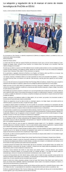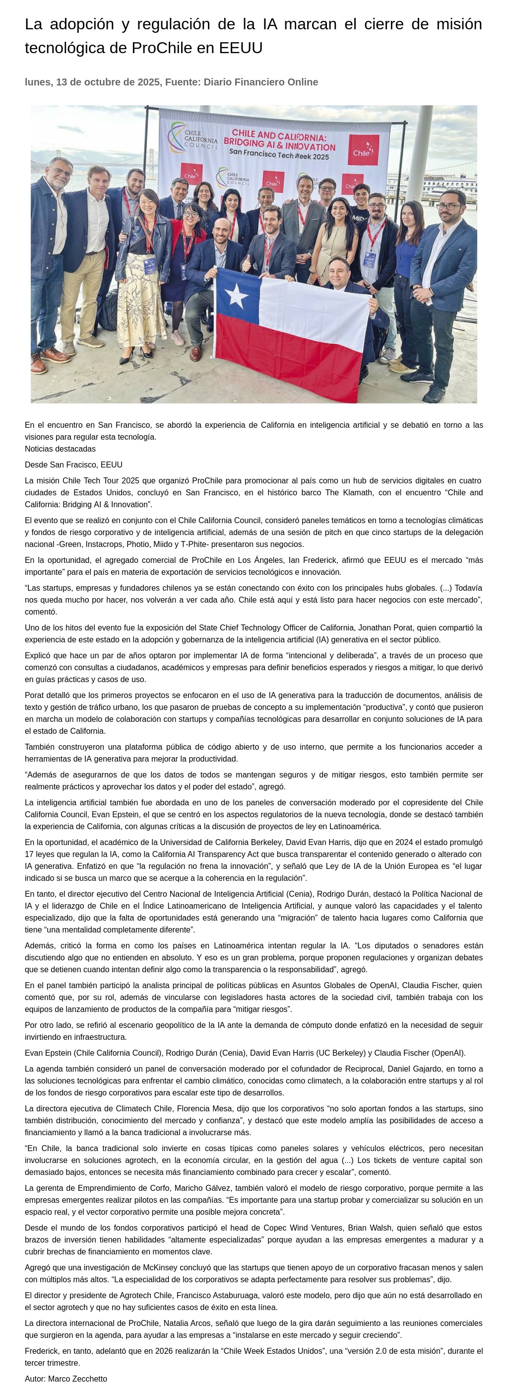 La adopción y regulación de la IA marcan el cierre de misión tecnológica de ProChile en EEUU 13-10-2025 Diario Financiero Online En el encuentro en San Francisco, se abordó la experiencia de California en inteligencia artificial y se debatió en torno a las visiones para regular esta tecnología. Noticias destacadas |