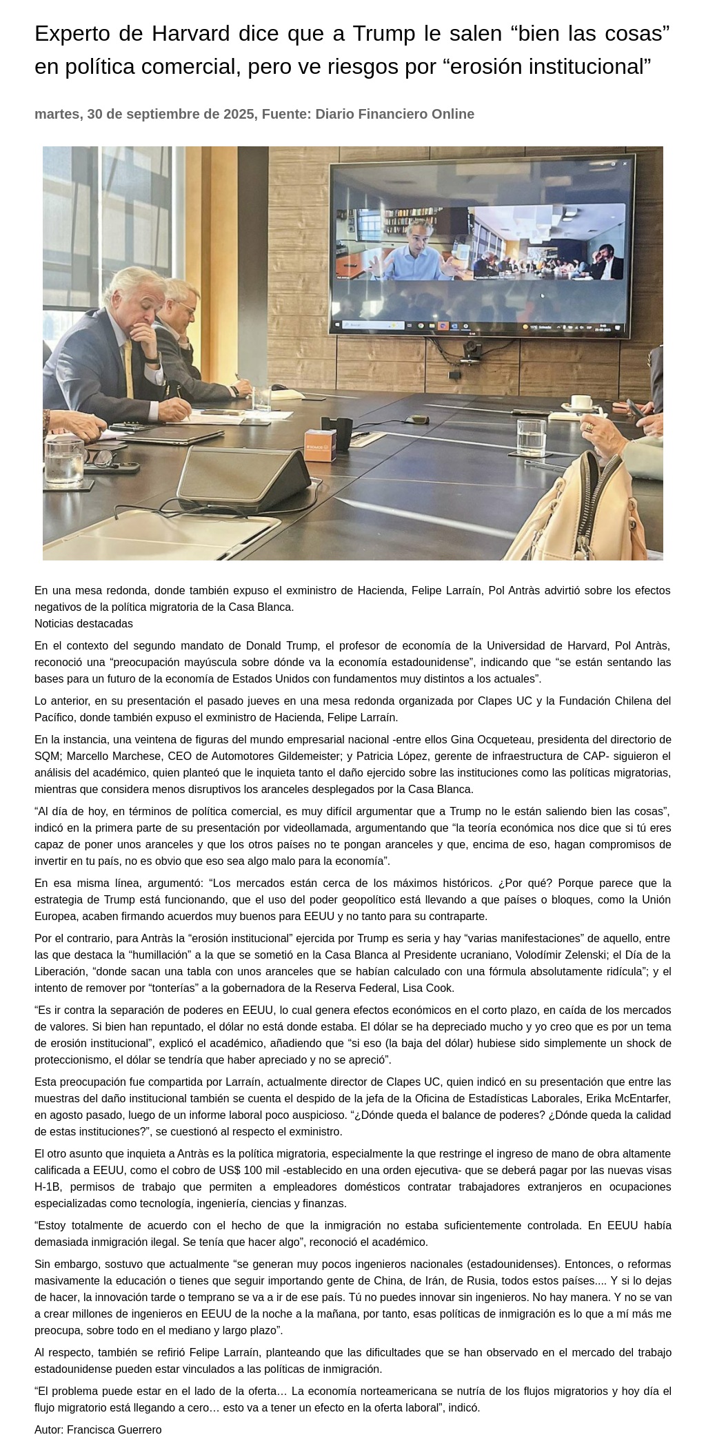 En una mesa redonda, donde también expuso el exministro de Hacienda, Felipe Larraín, Pol Antràs advirtió sobre los efectos negativos de la política migratoria de la Casa Blanca.
