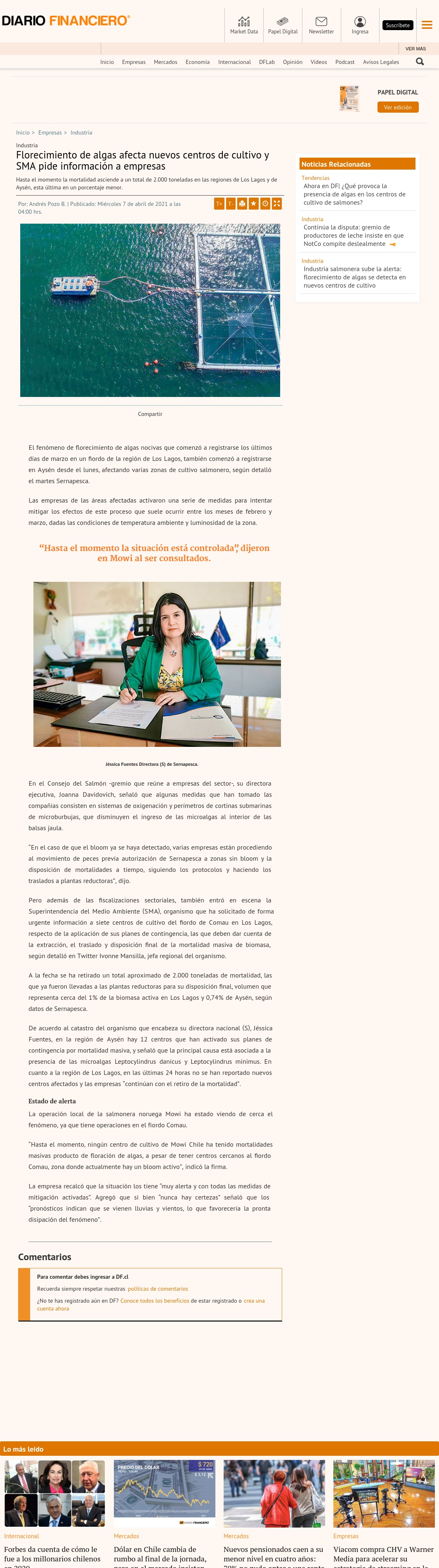 En cuanto a la región de Los Lagos, en las últimas 24 horas no se han reportado nuevos centros afectados y las empresas “continúan con el retiro de la mortalidad”. Estado de alertaLa operación local de la salmonera noruega Mowi ha estado viendo de cerca el fenómeno, ya que tiene operaciones en el fiordo Comau.