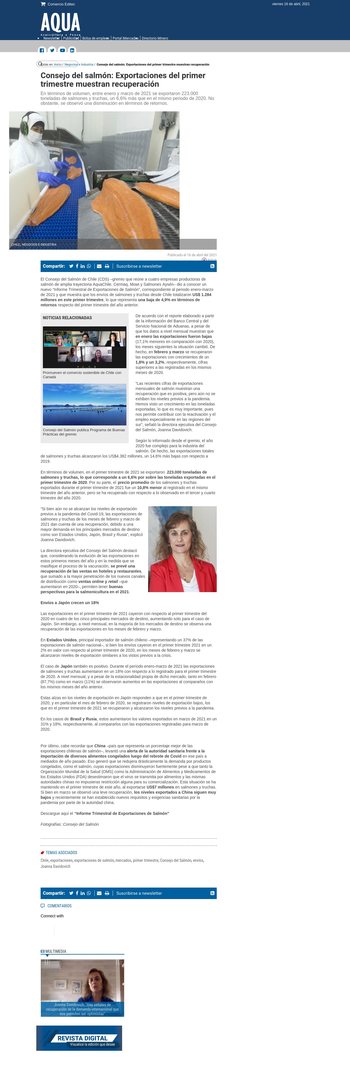 Consejo del Salmón destacó que, considerando la evolución de las exportaciones en estos primeros meses del año y en la medida que se masifique el proceso de la vacunación,, que sumado a la mayor penetración de los nuevos canales de distribución como ”“que aumentaron en 2020”“, permiten tener. Las exportaciones en el primer trimestre de 2021 cayeron con respecto al primer trimestre del 2020 en cuatro de los cinco principales mercados de destino, aumentando solo para el caso de Japón. Sin embargo, a nivel mensual, en la mayoría de los mercados de destino se observa una recuperación de las exportaciones en los meses de febrero y marzo.