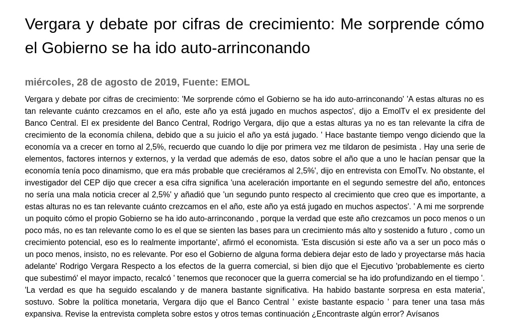 Vergara y debate por cifras de crecimiento: "Me sorprende cómo el Gobierno se ha ido auto-arrinconando" "A estas alturas no es tan relevante cuánto crezcamos en el año, este año ya está jugado en muchos aspectos", dijo a EmolTv el ex presidente del Banco Central. El ex presidente del Banco Central, Rodrigo Vergara, dijo que a estas alturas ya no es tan relevante la cifra de crecimiento de la economía chilena, debido que a su juicio el año ya está jugado. " Hace bastante tiempo vengo diciendo que la economía va a crecer en torno al 2,5%, recuerdo que cuando lo dije por primera vez me tildaron de pesimista . Hay una serie de elementos, factores internos y externos, y la verdad que además de eso, datos sobre el año que a uno le hacían pensar que la economía tenía poco dinamismo, que era más probable que creciéramos al 2,5%", dijo en entrevista con EmolTv. No obstante, el investigador del CEP dijo que crecer a esa cifra significa "una aceleración importante en el segundo semestre del año, entonces no sería una mala noticia crecer al 2,5%" y añadió que "un segundo punto respecto al crecimiento que creo que es importante, a estas alturas no es tan relevante cuánto crezcamos en el año, este año ya está jugado en muchos aspectos". " A mi me sorprende un poquito cómo el propio Gobierno se ha ido auto-arrinconando , porque la verdad que este año crezcamos un poco menos o un poco más, no es tan relevante como lo es el que se sienten las bases para un crecimiento más alto y sostenido a futuro , como un crecimiento potencial, eso es lo realmente importante", afirmó el economista. "Esta discusión si este año va a ser un poco más o un poco menos, insisto, no es relevante. Por eso el Gobierno de alguna forma debiera dejar esto de lado y proyectarse más hacia adelante" Rodrigo Vergara Respecto a los efectos de la guerra comercial, si bien dijo que el Ejecutivo "probablemente es cierto que subestimó" el mayor impacto, recalcó " tenemos que reconocer que la guerra comercial se ha ido profundizando en el tiempo ". "La verdad es que ha seguido escalando y de manera bastante significativa. Ha habido bastante sorpresa en esta materia", sostuvo. Sobre la política monetaria, Vergara dijo que el Banco Central " existe bastante espacio " para tener una tasa más expansiva. Revise la entrevista completa sobre estos y otros temas continuación ¿Encontraste algún error? Avísanos