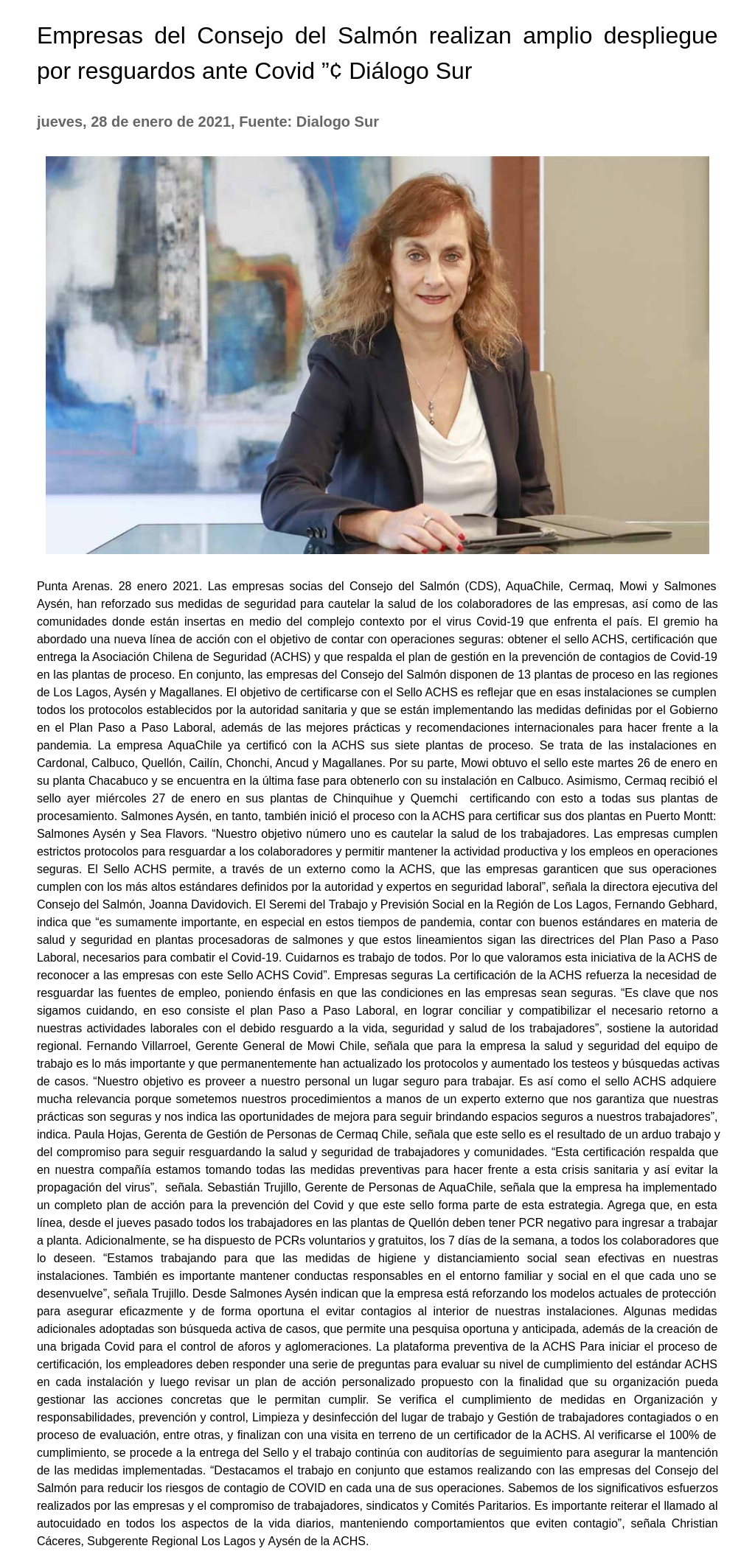 El objetivo de certificarse con el Sello ACHS es reflejar que en esas instalaciones se cumplen todos los protocolos establecidos por la autoridad sanitaria y que se están implementando las medidas definidas por el Gobierno en el Plan Paso a Paso Laboral, además de las mejores prácticas y recomendaciones internacionales para hacer frente a la pandemia. La empresa AquaChile ya certificó con la ACHS sus siete plantas de proceso. Se trata de las instalaciones en Cardonal, Calbuco, Quellón, Cailín, Chonchi, Ancud y Magallanes. Por su parte, Mowi obtuvo el sello este martes 26 de enero en su planta Chacabuco y se encuentra en la última fase para obtenerlo con su instalación en Calbuco. Asimismo, Cermaq recibió el sello ayer miércoles 27 de enero en sus plantas de Chinquihue y Quemchi certificando con esto a todas sus plantas de procesamiento. Salmones Aysén, en tanto, también inició el proceso con la ACHS para certificar sus dos plantas en Puerto Montt: Salmones Aysén y Sea Flavors. “Nuestro objetivo número uno es cautelar la salud de los trabajadores. Las empresas cumplen estrictos protocolos para resguardar a los colaboradores y permitir mantener la actividad productiva y los empleos en operaciones seguras.