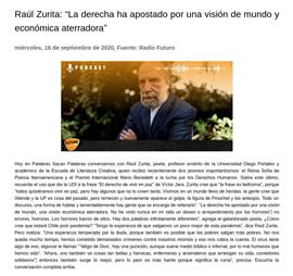 Universidad Diego Portales y académico de la Escuela de Literatura Creativa, quien recibió recientemente dos premios importantísimos: el Reina Sofía de Poesía Iberoamericana y el Premio Internacional Mario Benedetti a la lucha por los Derechos Humanos. Sobre este último, recuerda el uso que dio la UDI a la frase “El derecho de vivir en paz” de Víctor Jara. Zurita cree que “la frase es bellísima”, porque “todos quisiéramos vivir en paz, pero hay algunos que no lo creen tanto. Vivimos en un mundo lleno de heridas: la gente cree que Allende y la UP es cosa del pasado, pero remecen y nuevamente aparece el golpe, la figura de Pinochet y los anteojos. Todo un discurso, una forma de hablar y lamentablemente hay gente que se encarga de reiterarlo”. “La derecha ha apostado por una visión de mundo, una visión económica aterradora. No he visto nunca en mi vida un deseo o arrepentimiento por los horrores”¦ no errores, horrores. Los horrores fueron de ellos. Hay dos palabras infinitamente diferentes”, agrega el galardonado poeta. ¿Cómo cree que estará Chile post pandemia? “Tengo la esperanza de que salgamos un poco mejor de esta pandemia”, dice Raúl Zurita. Pero matiza: “Una esperanza temperada por la duda, porque también es posible que los pobres salgan más pobres. No nos queda mucho tiempo, hemos cometido demasiados crímenes contra nosotros mismos y eso nos cobra la cuenta.