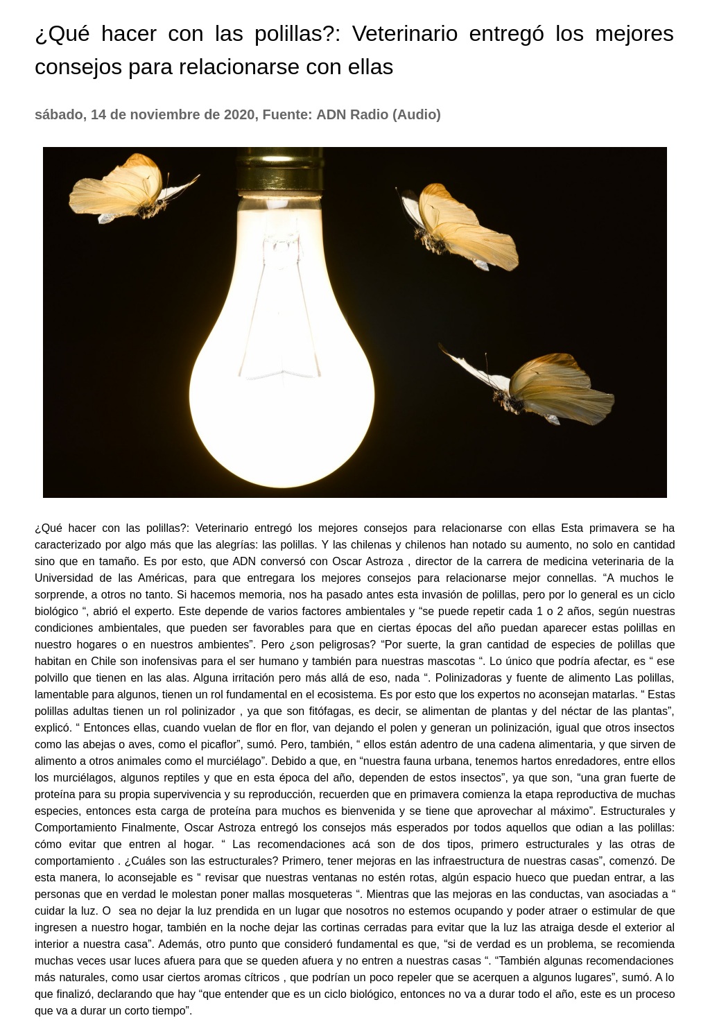 ¿ Qué hacer con las polillas?: Veterinario entregó los mejores consejos para relacionarse con ellas Esta primavera se ha caracterizado por algo más que las alegrías: las polillas. Y las chilenas y chilenos han notado su aumento, no solo en cantidad sino que en tamaño. Es por esto, que ADN conversó con Oscar Astroza, director de la carrera de medicina veterinaria de la