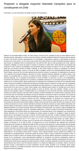 Paralelamente, desde diversas expresiones sociales autónomas, también se levantan propuestas de incidencia para que existan representaciones que actúen a favor de intereses colectivos y se cumplan las obligaciones en principios, valores y normas en derechos humanos y democráticos en la nueva Constitución, de forma simple, accesible en sus contenidos, eficaz, directa, pluralista y basada en un estándar de derechos. Entre estos nombres, está surgiendo con fuerza el de Natividad Llanquileo. Equipo Comunicaciones Mapuche