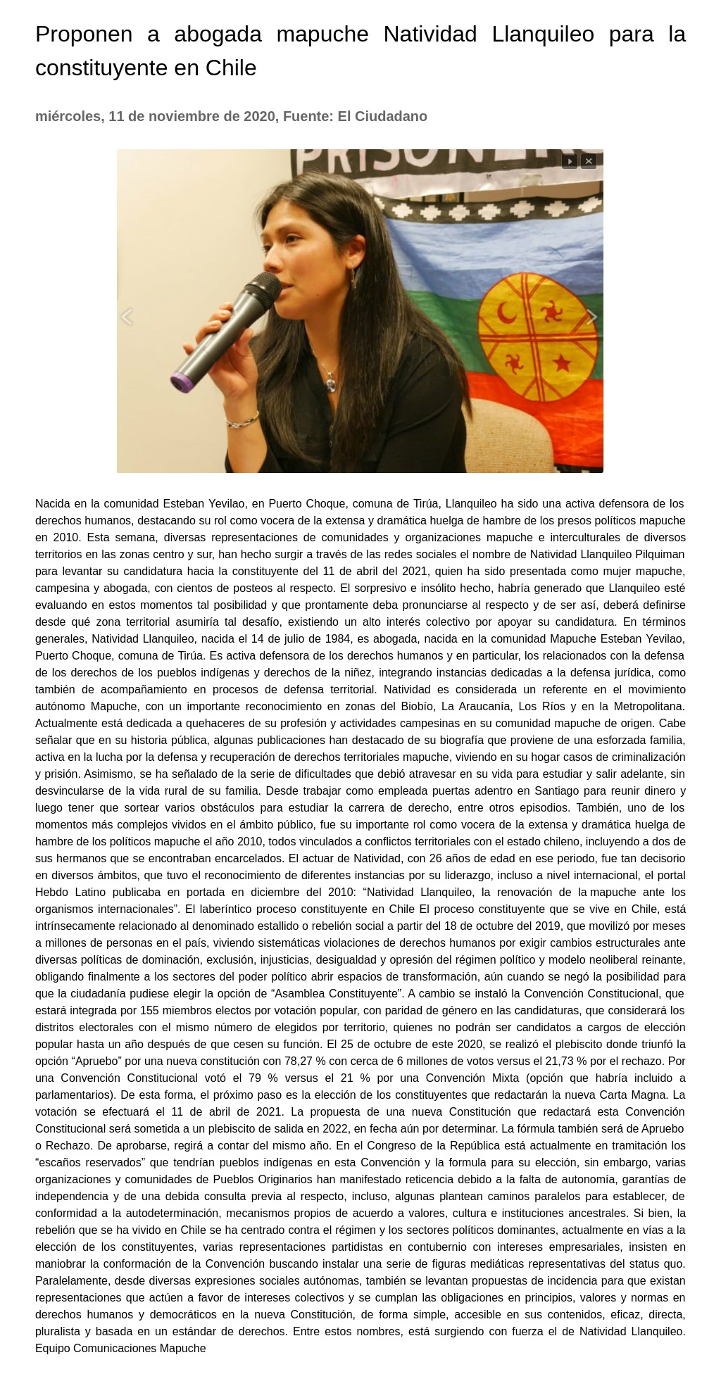 Esta semana, diversas representaciones de comunidades y organizaciones mapuche e interculturales de diversos territorios en las zonas centro y sur, han hecho surgir a través de las redes sociales el nombre de Natividad Llanquileo Pilquiman para levantar su candidatura hacia la constituyente del 11 de abril del 2021, quien ha sido presentada como mujer mapuche, campesina y abogada, con cientos de posteos al respecto.