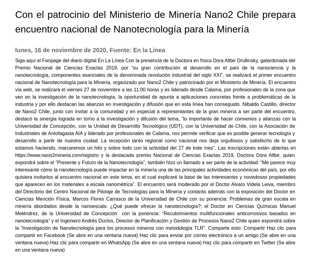 Siga aquí el Fanpage del diario digital En La Línea Con la presencia de la Doctora en física Dora Altbir Drullinsky, galardonada del Premio Nacional de Ciencias Exactas 2019, por “su gran contribución al desarrollo en el país de la nanociencia y la nanotecnología, componentes esenciales de la denominada revolución industrial del siglo XXI”, se realizará el primer encuentro nacional de Nanotecnología para la Minería, organizado por Nano2 Chile y patrocinado por el Ministerio de Minería.