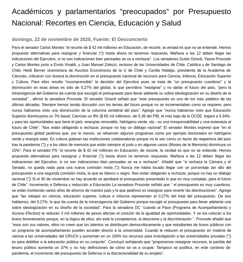 Académicos y parlamentarios “preocupados“ por Presupuesto Nacional: Recortes en Ciencia, Educación y Salud