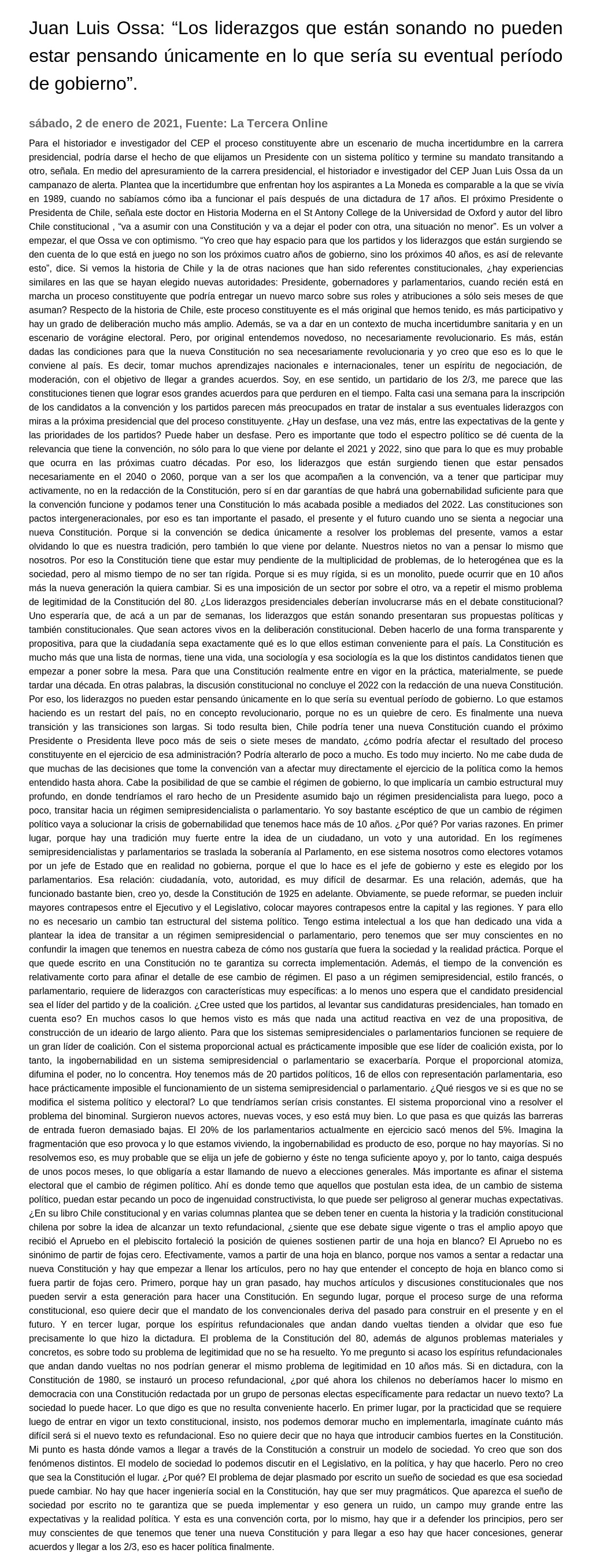 Juan Luis Ossa: “Los liderazgos que están sonando no pueden estar pensando únicamente en lo que sería su eventual período de gobierno”.