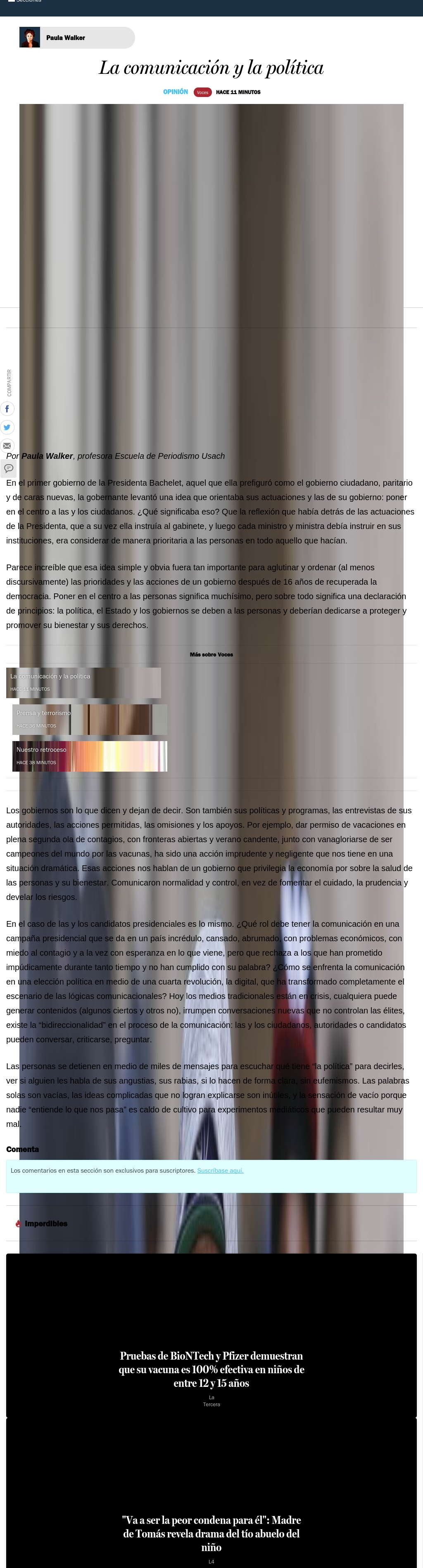 Paula Walker La comunicación y la política La comunicación y la política Opinión Comentarios Por Paula Walker, profesora Escuela de Periodismo Usach En el primer gobierno de la Presidenta Bachelet, aquel que ella prefiguró como el gobierno ciudadano, paritario y de caras nuevas, la gobernante levantó una idea que orientaba sus actuaciones y las de su gobierno: poner en el centro a las y los ciudadanos. ¿Qué significaba eso? Que la reflexión que había detrás de las actuaciones de la Presidenta, que a su vez ella instruía al gabinete, y luego cada ministro y ministra debía instruir en sus instituciones, era considerar de manera prioritaria a las personas en todo aquello que hacían. Parece increíble que esa idea simple y obvia fuera tan importante para aglutinar y ordenar (al menos discursivamente) las prioridades y las acciones de un gobierno después de 16 años de recuperada la democracia.