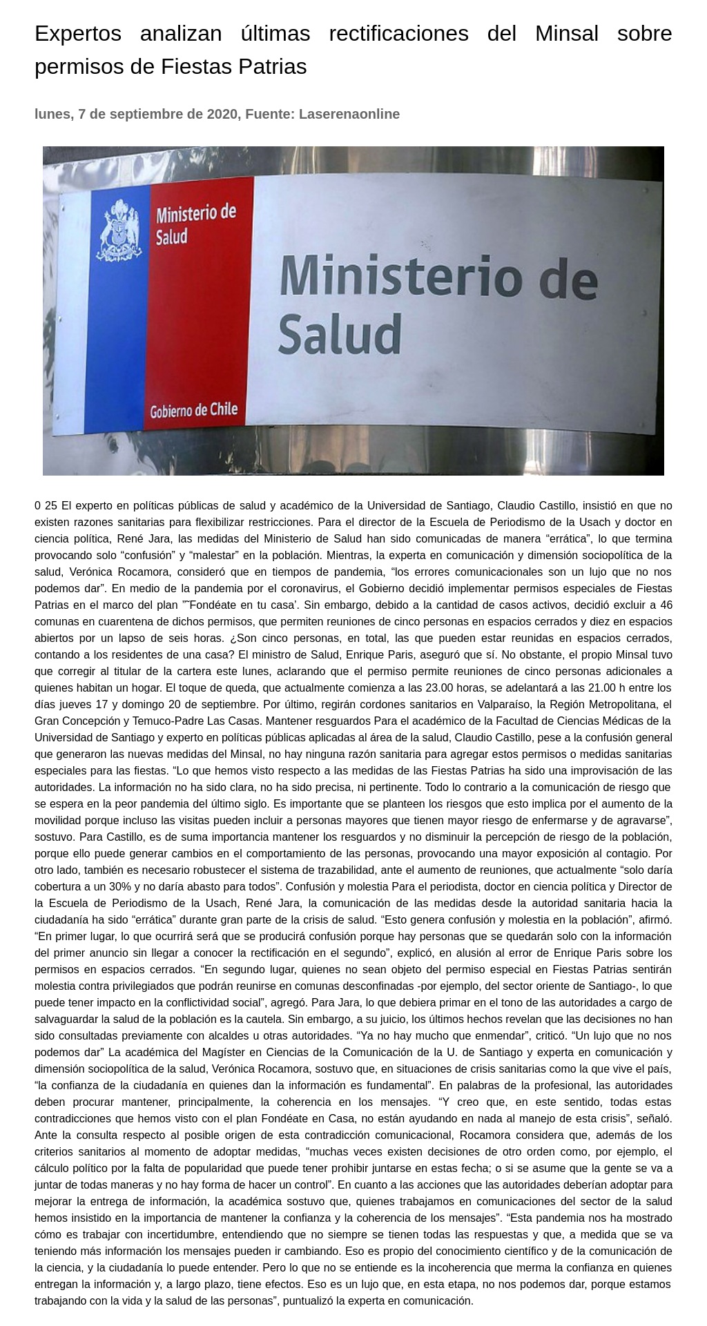 Mientras, la experta en comunicación y dimensión sociopolítica de la salud, Verónica Rocamora, consideró que en tiempos de pandemia, “los errores comunicacionales son un lujo que no nos podemos dar”. En medio de la pandemia por el coronavirus, el Gobierno decidió implementar permisos especiales de Fiestas Patrias en el marco del plan ”˜Fondéate en tu casa’. Sin embargo, debido a la cantidad de casos activos, decidió excluir a 46 comunas en cuarentena de dichos permisos, que permiten reuniones de cinco personas en espacios cerrados y diez en espacios abiertos por un lapso de seis horas. ¿Son cinco personas, en total, las que pueden estar reunidas en espacios cerrados, contando a los residentes de una casa? El ministro de Salud, Enrique Paris, aseguró que sí. No obstante, el propio Minsal tuvo que corregir al titular de la cartera este lunes, aclarando que el permiso permite reuniones de cinco personas adicionales a quienes habitan un hogar. El toque de queda, que actualmente comienza a las 23.00 horas, se adelantará a las 21.00 h entre los días jueves 17 y domingo 20 de septiembre. Por último, regirán cordones sanitarios en Valparaíso, la Región Metropolitana, el Gran Concepción y Temuco-Padre Las Casas.