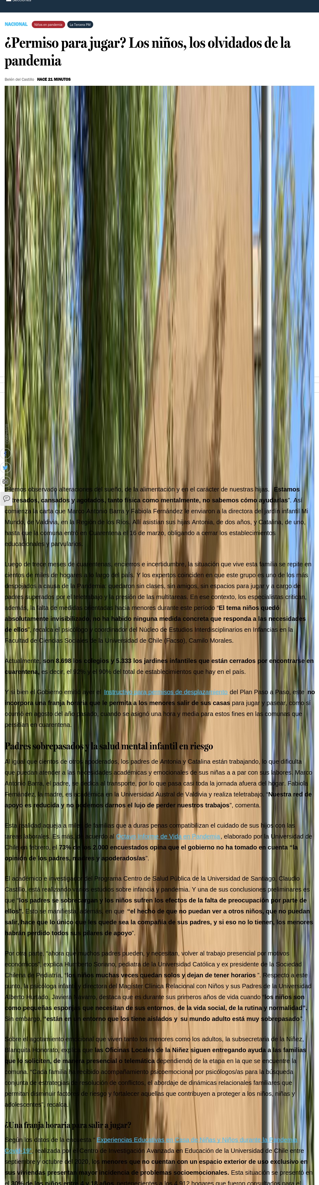 “ Es muy temprano para sacar a los niños pequeños, sobre todo por las bajas temperaturas de las mañanas ”. A su vez, el académico de la Fasco, Camilo Morales, sostiene que “me parece muy complicado que no se pueda considerar como una actividad crucial el jugar, correr, moverse, saltar, que son actividades esenciales para los niños, es lo que a ellos los constituye como sujetos (.. .) y de las cuales hoy están siendo privados”. De esta forma, el experto opina que “es urgente establecer una franja horaria para que los niños puedan salir de sus casas”. En este sentido, la educadora de párvulos y sostenedora del jardín infantil Mi Mundo, Kanda Reyes, aclara que los menores “aprenden por imitación, a través de juegos, compartiendo con sus pares en forma directa y espontánea ”. Así, Reyes dice que el comportamiento observado en Catalina y Antonia por sus padres es recurrente entre otros apoderados y se debe a que “el encierro en la casa es devastador para el desarrollo socioemocional de los pequeños”. Castillo respalda que se cree un permiso especial para la salida de los niños, pues “ es muy relevante disponer de una franja horaria y de otros permisos especiales para que los padres puedan sacar los niños a las plazas, puedan sacarlos a caminar”. En los últimos días ha tomado fuerza una campaña por redes sociales que promueven la instauración de permisos para la niñez en tiempos de encierro, a la que han suscrito varios miles de padres. Sobre esta posibilidad, la subsecretaria Honorato revela que “hemos estado en constante coordinación con el Ministerio de Salud y la Subsecretaría de Prevención del Delito para monitorear este tema. Los factores epidemiológicos y el avance de la pandemia van a determinar si en algún momento es posible restablecer esta franja especial.