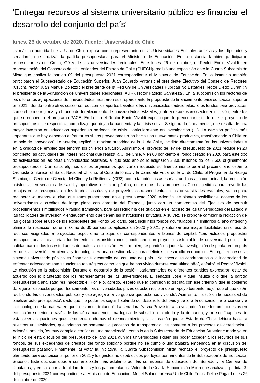 La máxima autoridad de la U. de Chile expuso como representante de las Universidades Estatales ante las y los diputados y senadores que analizan la partida presupuestaria para el Ministerio de Educación. En la instancia también participaron representantes del Cruch, G9 y de las universidades regionales. Este lunes 26 de octubre, el Rector Ennio Vivaldi -en representación del Consorcio de Universidades del Estado de Chile (CUECH)- realizó una exposición ante la Cuarta Subcomisión Mixta que analiza la partida 09 del presupuesto 2021 correspondiente al Ministerio de Educación. En la instancia también participaron el Subsecretario de Educación Superior, Juan Eduardo Vargas ; el presidente Ejecutivo del Consejo de Rectores (Cruch), rector Juan Manuel Zolezzi ; el presidente de la Red G9 de Universidades Públicas No Estatales, rector Diego Durán ; y el presidente de la Agrupación de Universidades Regionales (AUR), rector Patricio Sanhueza. En la subcomisión los rectores de las diferentes agrupaciones de universidades mostraron sus reparos ante la propuesta de financiamiento para educación superior en 2021, donde -entre otras cosas- se reducen los aportes basales a las universidades tradicionales; a los fondos para proyectos, como el fondo regional y el fondo de fortalecimiento de universidades estatales; junto a recursos asociados a inclusión, entre los que se encuentra el programa PACE. En la cita el Rector Ennio Vivaldi expuso que “lo preocupante es lo que el proyecto de presupuestos dice respecto al aprendizaje que dejan la pandemia y la crisis social. Se ignora lo fundamental, que resulta de una mayor inversión en educación superior en períodos de crisis, particularmente en investigación (…). La decisión política más importante que hoy debemos enfrentar es si nos proyectamos o no hacia una nueva matriz productiva, transformando a Chile en un polo de innovación”. Lo anterior, explicó la máxima autoridad de la U. de Chile, incidiría directamente “en las universidades y en la calidad del empleo que tendrán los chilenos a futuro”. Asimismo, el proyecto de ley del presupuesto de 2021 reduce en 20 por ciento las actividades de interés nacional que realiza la U. de Chile, y en 60 por ciento el fondo creado en 2020 para este tipo de actividades en las otras universidades estatales, al que este año se le asignaron 3.300 millones de los 8.600 originalmente presupuestados. Con esto, algunos de los organismos que verían reducido su financiamiento para el próximo año están la Orquesta Sinfónica, el Ballet Nacional Chileno, el Coro Sinfónico y la Camerata Vocal de la U. de Chile, el Programa de Riesgo Sísmico, el Centro de Ciencia del Clima y la Risiliencia (CR2), como también las asesorías jurídicas a la comunidad, la prestación asistencial en servicios de salud y operativos de salud pública, entre otros. Las propuestas Como medidas para revertir las rebajas en el presupuesto a los fondos basales y de proyectos correspondientes a las universidades estatales, se propone recuperar -al menos- el nivel que estos presentaban en el presupuesto 2020. Además, se plantea posibilitar el acceso de las universidades a créditos de largo plazo con garantía del Estado, junto con un compromiso del Ejecutivo de permitir procedimientos simplificados y rápida tramitación, para así reducir la desigualdad en el acceso de las universidades del Estado a las facilidades de inversión y endeudamiento que tienen las instituciones privadas. A su vez, se propone cambiar la redacción de las glosas sobre el uso de los excedentes del Fondo Solidario, para incluir los fondos acumulados sin limitarlos al año anterior y eliminar la restricción de un máximo de 30 por ciento, aplicada en 2020 y 2021, y autorizar una mayor flexibilidad en el uso de recursos asignados a proyectos, especialmente aquellos correspondientes a bienes de capital. “Las actuales propuestas presupuestarias impactarían fuertemente a las instituciones, hipotecando un proyecto sustentable de universidad pública de calidad para todos los estudiantes del país, sin exclusión. Así también, se pondrá en jaque la investigación de punta, en un país en que la inversión en ciencia y tecnología es una cuestión clave para definir su desarrollo económico. Entregar recursos al sistema universitario público es financiar el desarrollo del conjunto del país. No hacerlo es condenarnos a la incapacidad de enfrentar adecuadamente situaciones tan trágicas como las que hemos vivido durante este último año”, enfatizó el Rector Vivaldi. La discusión en la subcomisión Durante el desarrollo de la sesión, parlamentarios de diferentes partidos expresaron estar de acuerdo con lo planteado por los representantes de las universidades. El senador José Miguel Insulza dijo que la partida presupuestaria analizada “es inaceptable". Por ello, agregó, "espero que la comisión lo discuta con ese criterio y que el gobierno de alguna respuesta porque, francamente, las universidades privadas están recibiendo un apoyo bastante mejor que el que están recibiendo las universidades públicas y eso agrega a la vergüenza que estamos viviendo". Asimismo, insistió en la necesidad de "analizar este presupuesto", dado que "no podemos seguir hablando del desarrollo del país y tratar a la educación, a la ciencia y a la tecnología de la manera en que la estamos tratando”. La senadora Yasna Provoste, a su vez, criticó que los presupuestos en educación superior a través de los años mantienen una lógica de subsidio a la oferta y la demanda, y no son “capaces de establecer asignaciones que incrementen además el reconocimiento y la valoración que el Estado de Chile debiera hacer a nuestras universidades, que además se somenten a procesos de transparencia, se someten a los procesos de acreditacion". Además, advirtió, "es muy complejo confiar en una organización como lo es la Subsecretaría de Educación Superior cua