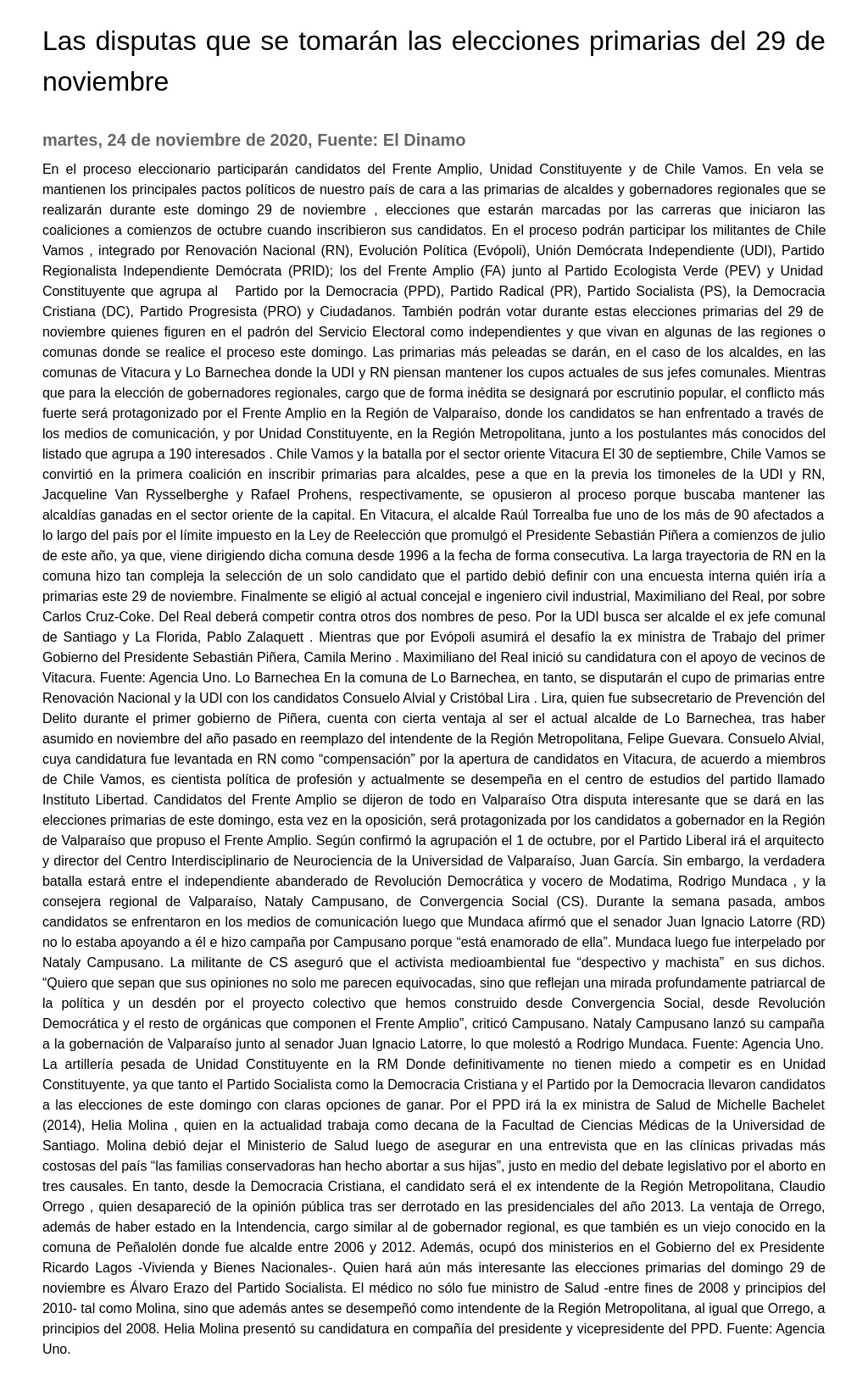 También podrán votar durante estas elecciones primarias del 29 de noviembre quienes figuren en el padrón del Servicio Electoral como independientes y que vivan en algunas de las regiones o comunas donde se realice el proceso este domingo. Las primarias más peleadas se darán, en el caso de los alcaldes, en las comunas de Vitacura y Lo Barnechea donde la UDI y RN piensan mantener los cupos actuales de sus jefes comunales.