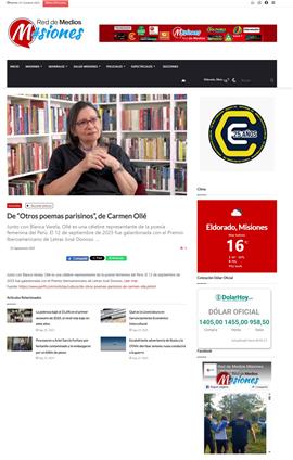 De “Otros poemas parisinos”, de Carmen Ollé 25-09-2025 (ARG) reddemediosmisiones.com.ar Junto con Blanca Varela, Ollé es una célebre representante de la poesía femenina del Perú. El 12 de septiembre de 2025 fue galardonada con el Premio Iberoamericano de Letras José Donoso. ... Junto... |