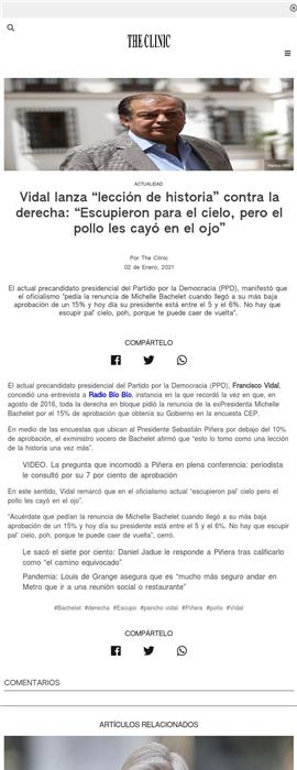 En medio de las encuestas que ubican al Presidente Sebastián Piñera por debajo del 10% de aprobación, el exministro vocero de Bachelet afirmó que “esto lo tomo como una lección de la historia una vez más”. En este sentido, Vidal remarcó que en el oficialismo actual “escupieron pal’ cielo pero el pollo les cayó en el ojo”. “Acuérdate que pedían la renuncia de Michelle Bachelet cuando llegó a su más baja aprobación de un 15% y hoy día su presidente está entre el 5 y el 6%. No hay que escupir pal’ cielo, poh, porque te puede caer de vuelta”, cerró.