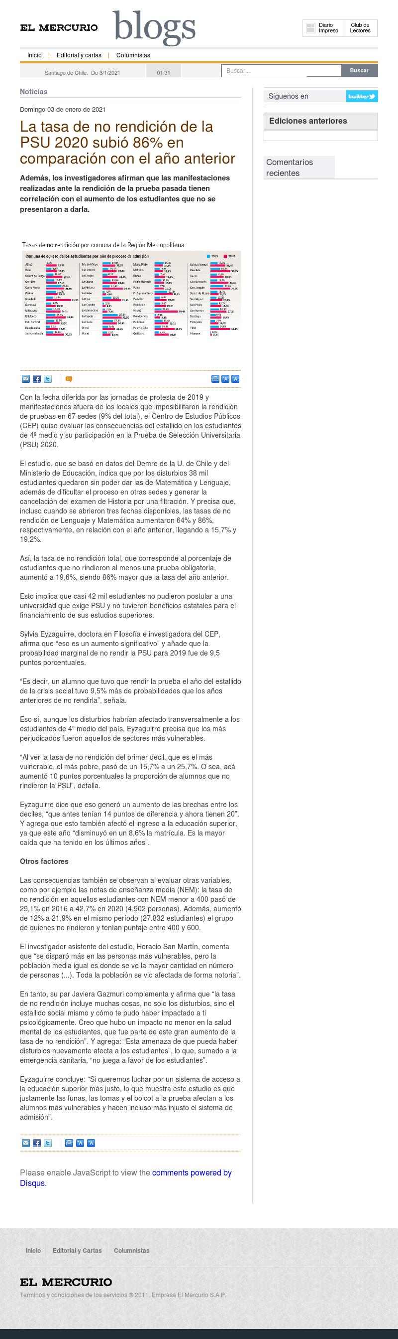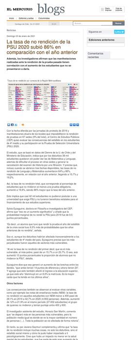 Creo que hubo un impacto no menor en la salud mental de los estudiantes, que fue parte de este gran aumento de la tasa de no rendición”. Y agrega: “Esta amenaza de que pueda haber disturbios nuevamente afecta a los estudiantes”, lo que, sumado a la emergencia sanitaria, “no juega a favor de los estudiantes”. Eyzaguirre concluye: “Si queremos luchar por un sistema de acceso a la educación superior más justo, lo que muestra este estudio es que justamente las funas, las tomas y el boicot a la prueba afectan a los alumnos más vulnerables y hacen incluso más injusto el sistema de admisión”.