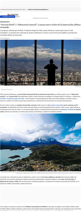 “Terreno fértil” y “laboratorio natural”. Lanzan nuevo relato de la innovación chilena al mundo 22-12-2025 La Tercera Online La propuesta, liderada por ProChile, espera fortalecer a nuestro país como un "hub tecnológico". La narrativa fue construida de manera colaborativa y reunió a cerca de 40 actores públicos y privad... |