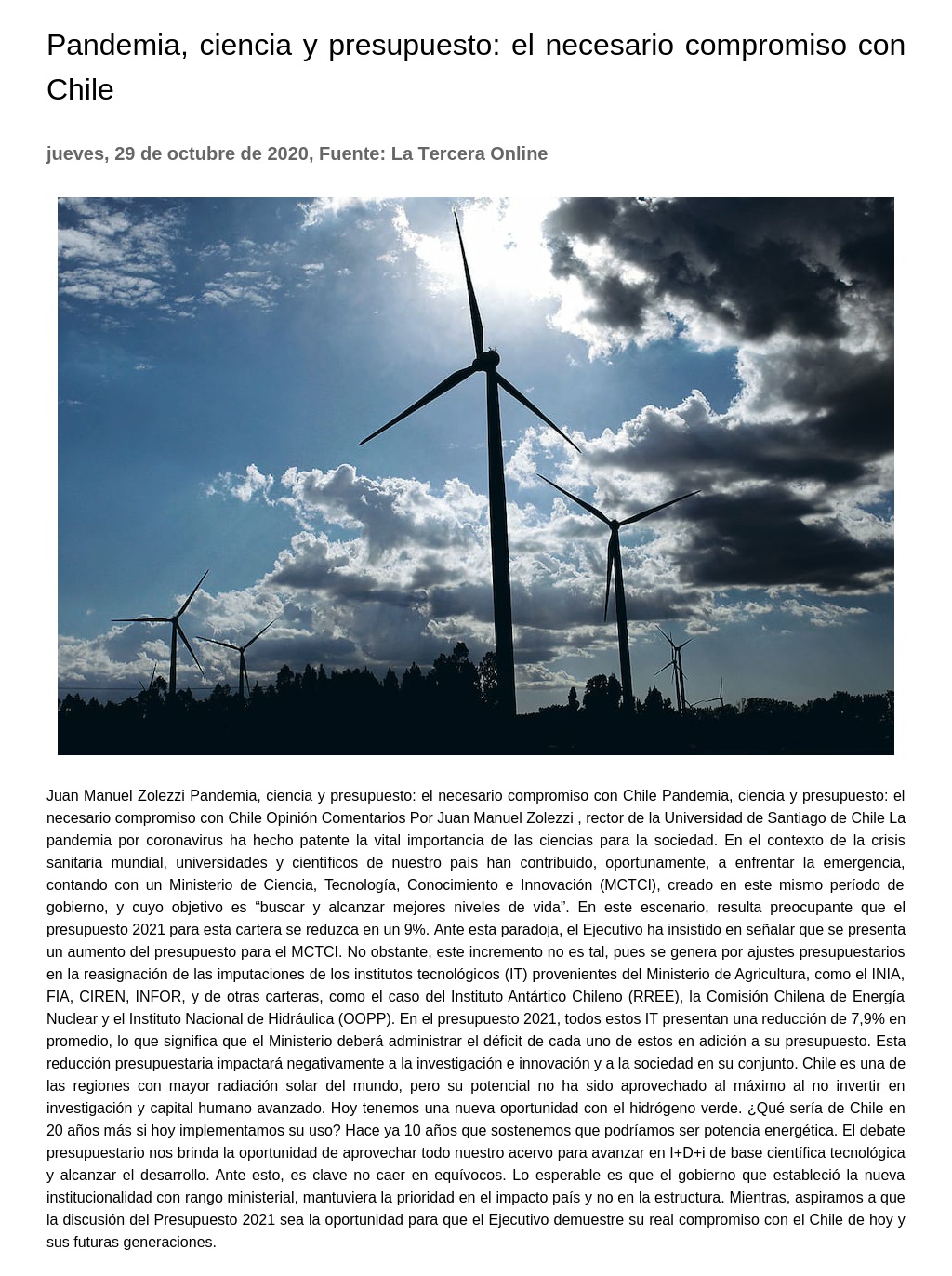 No obstante, este incremento no es tal, pues se genera por ajustes presupuestarios en la reasignación de las imputaciones de los institutos tecnológicos (IT) provenientes del Ministerio de Agricultura, como el INIA, FIA, CIREN, INFOR, y de otras carteras, como el caso del Instituto Antártico Chileno (RREE), la Comisión Chilena de Energía Nuclear y el Instituto Nacional de Hidráulica (OOPP). En el presupuesto 2021, todos estos IT presentan una reducción de 7,9% en promedio, lo que significa que el Ministerio deberá administrar el déficit de cada uno de estos en adición a su presupuesto. Esta reducción presupuestaria impactará negativamente a la investigación e innovación y a la sociedad en su conjunto. Chile es una de las regiones con mayor radiación solar del mundo, pero su potencial no ha sido aprovechado al máximo al no invertir en investigación y capital humano avanzado. Hoy tenemos una nueva oportunidad con el hidrógeno verde. ¿Qué sería de Chile en 20 años más si hoy implementamos su uso? Hace ya 10 años que sostenemos que podríamos ser potencia energética. El debate presupuestario nos brinda la oportunidad de aprovechar todo nuestro acervo para avanzar en I+D+i de base científica tecnológica y alcanzar el desarrollo. Ante esto, es clave no caer en equívocos. Lo esperable es que el gobierno que estableció la nueva institucionalidad con rango ministerial, mantuviera la prioridad en el impacto país y no en la estructura. Mientras, aspiramos a que la discusión del Presupuesto 2021 sea la oportunidad para que el Ejecutivo demuestre su real compromiso con el Chile de hoy y sus futuras generaciones.