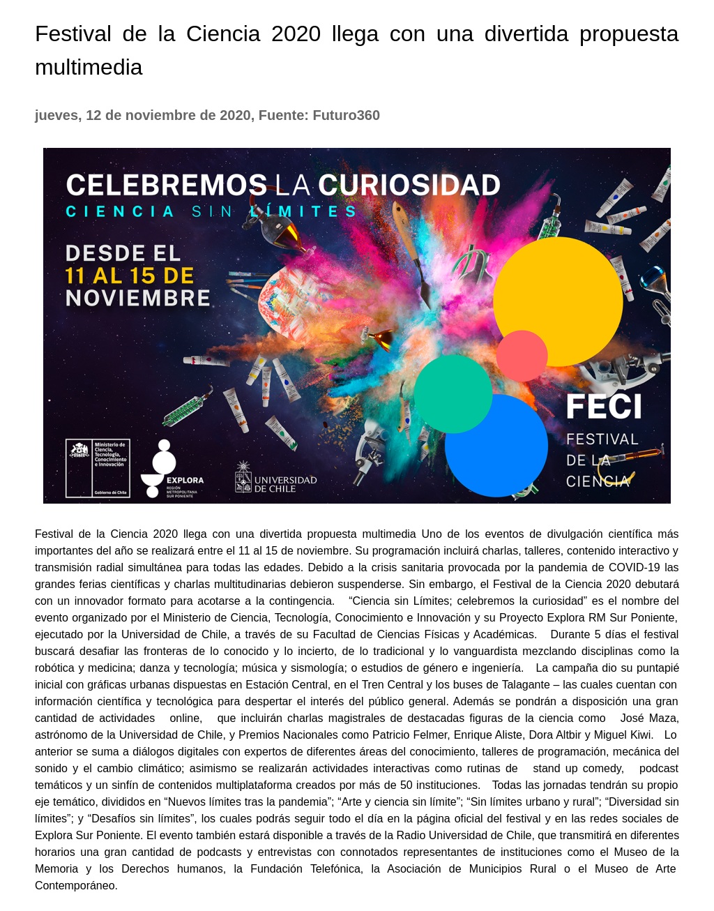 Sin embargo, el Festival de la Ciencia 2020 debutará con un innovador formato para acotarse a la contingencia. “Ciencia sin Límites; celebremos la curiosidad” es el nombre del evento organizado por el Ministerio de Ciencia, Tecnología, Conocimiento e Innovación y su Proyecto Explora RM Sur Poniente, ejecutado por la Universidad de Chile, a través de su Facultad de Ciencias Físicas y Académicas. Durante 5 días el festival buscará desafiar las fronteras de lo conocido y lo incierto, de lo tradicional y lo vanguardista mezclando disciplinas como la robótica y medicina; danza y tecnología; música y sismología; o estudios de género e ingeniería. La campaña dio su puntapié inicial con gráficas urbanas dispuestas en Estación Central, en el Tren Central y los buses de Talagante – las cuales cuentan con información científica y tecnológica para despertar el interés del público general.