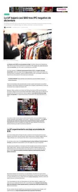 “Los consumidores se van a ver favorecidos por esta menor inflación, debido a una reducción en la Unidad de Fomento (UF), lo que llevará a que, durante el mes de enero, bajen los dividendos y todos aquellos planes y contratos que están expresados en UF”, afirmó el economista. En ese contexto, Escobar detalló que, de mantenerse las proyecciones actuales, la UF experimentaría una baja acumulada de $79 hasta el próximo 9 de febrero.
