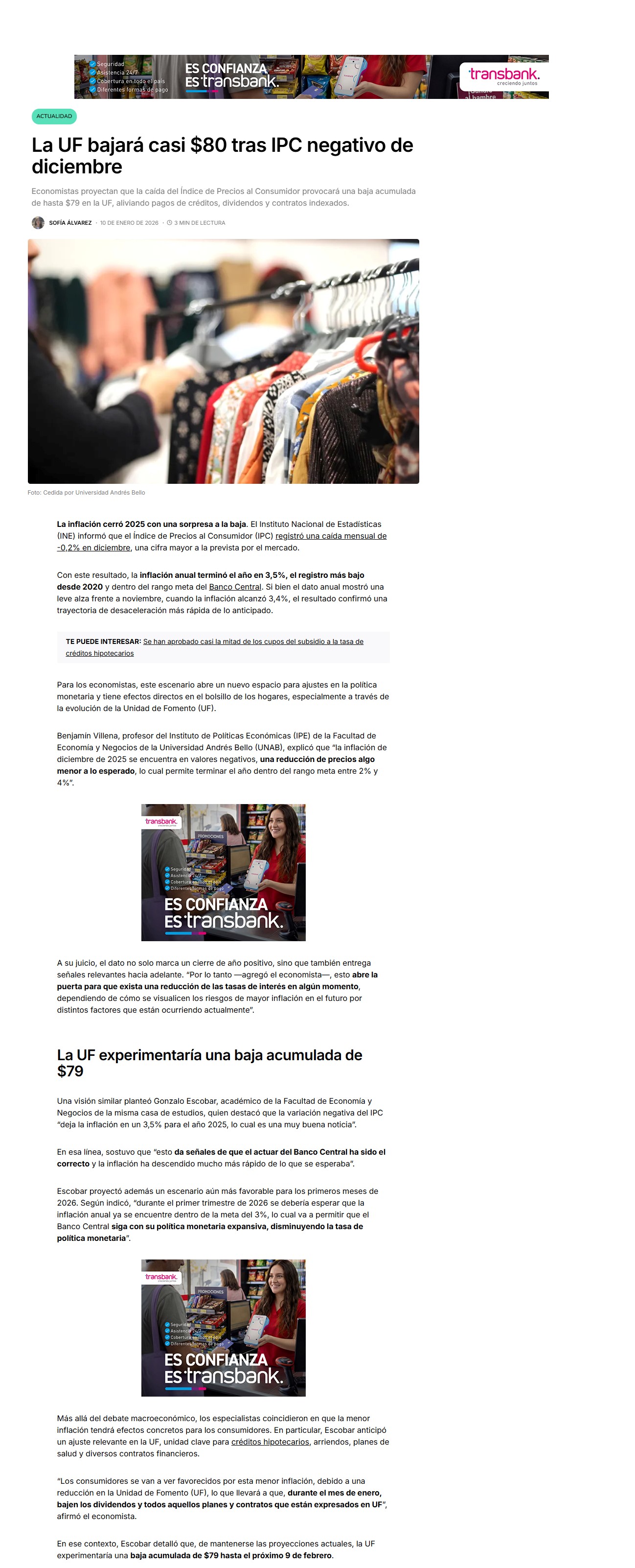“Por lo tanto —agregó el economista—, esto abre la puerta para que exista una reducción de las tasas de interés en algún momento, dependiendo de cómo se visualicen los riesgos de mayor inflación en el futuro por distintos factores que están ocurriendo actualmente”. La UF experimentaría una baja acumulada de $79 Una visión similar planteó Gonzalo Escobar, académico de la Facultad de Economía y Negocios de la misma casa de estudios, quien destacó que la variación negativa del IPC “deja la inflación en un 3,5% para el año 2025, lo cual es una muy buena noticia”. En esa línea, sostuvo que “esto da señales de que el actuar del Banco Central ha sido el correcto y la inflación ha descendido mucho más rápido de lo que se esperaba”. Escobar proyectó además un escenario aún más favorable para los primeros meses de 2026.
