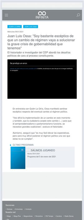 Juan Luis Ossa: "Soy bastante escéptico de que un cambio de régimen vaya a solucionar la grave crisis de gobernabilidad que tenemos" 06-01-2021 Radio Infinita El historiador e investigador del CEP abordó los desafíos políticos de cara al proceso constituyente. } En entrevista con Quién Lo Diría, Ossa manifestó sentirse escéptico respecto del eventual camb... |