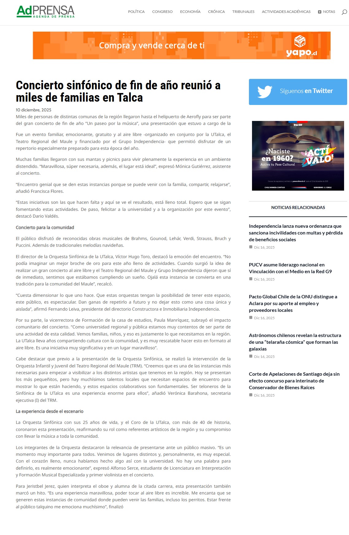 UTalca, el Teatro Regional del Maule y financiado por el Grupo Independencia- que permitió disfrutar de un repertorio especialmente preparado para esta época del año. Muchas familias llegaron con sus mantas y picnics para vivir plenamente la experiencia en un ambiente distendido. “Maravillosa, súper necesaria, además, el lugar está ideal”, expresó Mónica Gutiérrez, asistente al concierto. “Encuentro genial que se den estas instancias porque se puede venir con la familia, compartir, relajarse”, añadió Francisca Flores. “Estas iniciativas son las que hacen falta y aquí se ve el resultado, está lleno total. Espero que se sigan fomentando estas actividades. De paso, felicitar a la universidad y a la organización por este evento”, destacó Dario Valdés. Concierto para la comunidad El público disfrutó de reconocidas obras musicales de Brahms, Gounod, Lehár, Verdi, Strauss, Bruch y Puccini. Además de tradicionales melodías navideñas. El director de la Orquesta Sinfónica de la