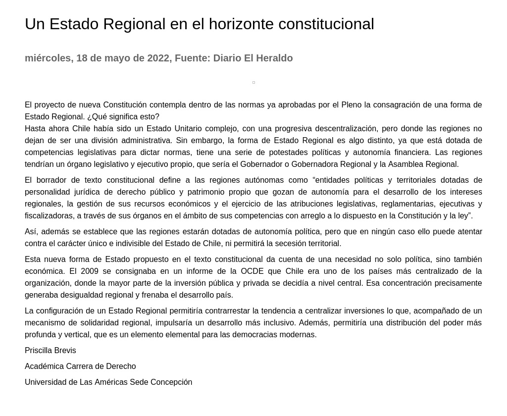Un Estado Regional en el horizonte constitucional 18-05-2022 Diario El Heraldo El proyecto de nueva Constitución contempla dentro de las normas ya aprobadas por el Pleno la consagración de una forma de Estado Regional. ¿Qué significa esto? Hasta ahora Chile había sido un E... |
