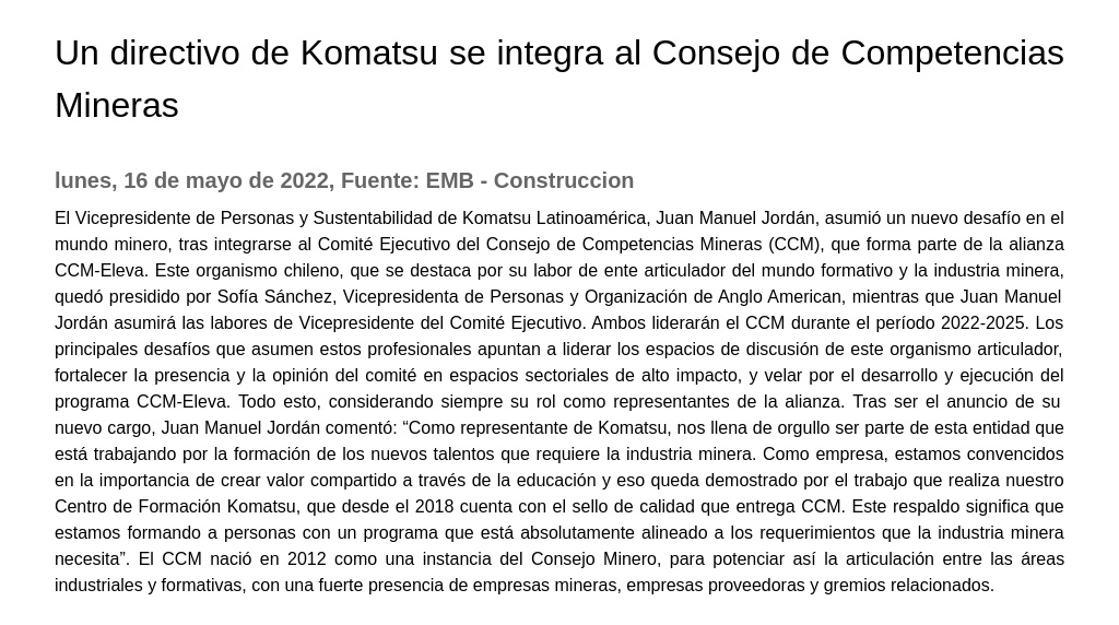 El Vicepresidente de Personas y Sustentabilidad de Komatsu Latinoamérica, Juan Manuel Jordán, asumió un nuevo desafío en el mundo minero, tras integrarse al Comité Ejecutivo del Consejo de Competencias Mineras (CCM), que forma parte de la alianza CCM-Eleva., Este organismo chileno, que se destaca por su labor de ente articulador del mundo formativo y la industria minera, quedó presidido por Sofía Sánchez, Vicepresidenta de Personas y Organización de Anglo American, mientras que Juan Manuel Jordán asumirá las labores de Vicepresidente del Comité Ejecutivo., Los principales desafíos que asumen estos profesionales apuntan a liderar los espacios de discusión de este organismo articulador, fortalecer la presencia y la opinión del comité en espacios sectoriales de alto impacto, y velar por el desarrollo y ejecución del programa CCM-Eleva., El CCM nació en 2012 como una instancia del Consejo Minero, para potenciar así la articulación entre las áreas industriales y formativas, con una fuerte presencia de empresas mineras, empresas proveedoras y gremios relacionados.