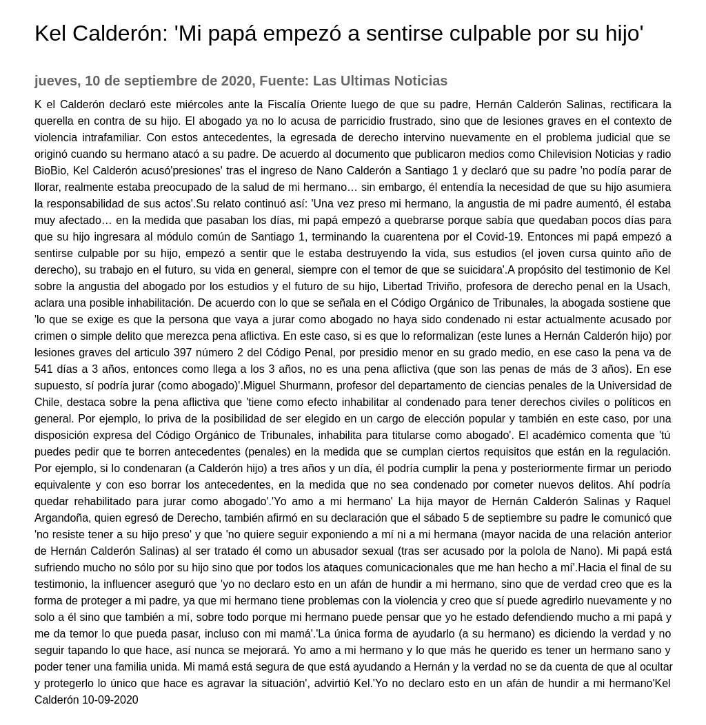 De acuerdo al documento que publicaron medios como Chilevision Noticias y radio BioBio, Kel Calderón acusó"presiones" tras el ingreso de Nano Calderón a Santiago 1 y declaró que su padre "no podía parar de llorar, realmente estaba preocupado de la salud de mi hermano… sin embargo, él entendía la necesidad de que su hijo asumiera la responsabilidad de sus actos". Su relato continuó así: "Una vez preso mi hermano, la angustia de mi padre aumentó, él estaba muy afectado… en la medida que pasaban los días, mi papá empezó a quebrarse porque sabía que quedaban pocos días para que su hijo ingresara al módulo común de Santiago 1, terminando la cuarentena por el Covid-19.