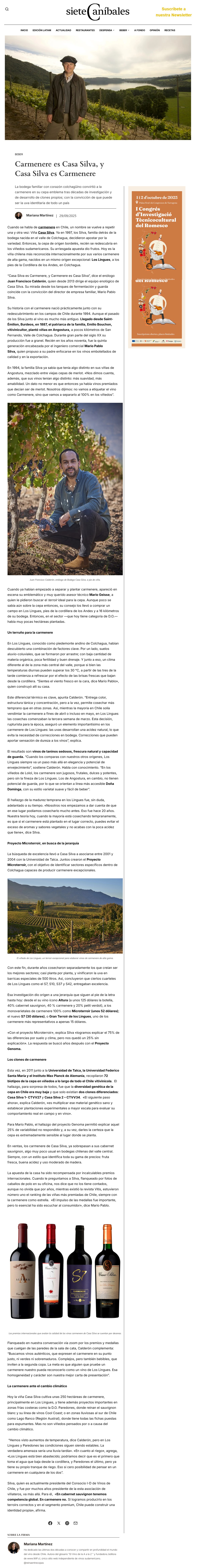 La bodega familiar con corazón colchagüino convirtió a la carmenere en su cepa emblema tras décadas de investigación y de desarrollo de clones propios; con la convicción de que puede ser la uva identitaria de todo un país Mariana Martínez Cuando se habla de carmenere en Chile, un nombre se vuelve a repetir una y otra vez: Viña Casa Silva. Ya en 1997, los Silva, familia detrás de la bodega nacida en el valle de Colchagua, decidieron apostar por la variedad. Entonces, la cepa de origen bordelés, recién se redescubría en los viñedos sudamericanos. Su arriesgada apuesta dio frutos. Hoy es la viña chilena más reconocida internacionalmente por sus varios carmenere de alta gama, nacidos en un mismo origen excepcional: Los Lingues, a los pies de la Cordillera de los Andes, en Colchagua. “Casa Silva es Carmenere, y Carmenere es Casa Silva”, dice el enólogo Juan Francisco Calderón, quien desde 2013 dirige el equipo enológico de Casa Silva. Su mirada desde los tanques de fermentación y guarda coincide con la convicción del director de empresa familiar, Mario Pablo Silva. Su historia con el carmenere nació prácticamente junto con su redescubrimiento en los campos de Chile durante 1994. Aunque el pasado de los Silva junto al vino es mucho más antiguo. Llegado desde Saint-Émilion, Burdeos, en 1887, el patriarca de la familia, Emilio Bouchon, vitivinicultor, plantó viñas en Angostura, a pocos kilómetros de San Fernando, Valle de Colchagua. Durante gran parte del siglo XX su producción fue a granel. Recién en los años noventa, fue la quinta generación encabezada por el ingeniero comercial Mario Pablo Silva, quien propuso a su padre enfocarse en los vinos embotellados de calidad y en la exportación.