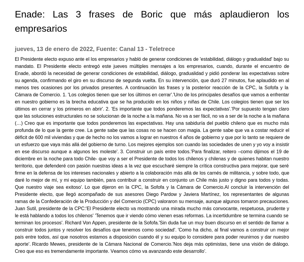 El Presidente electo entregó este jueves múltiples mensajes a los empresarios, cuando, durante el encuentro de Enade, abordó la necesidad de generar condiciones de estabilidad, diálogo, gradualidad y pidió ponderar las expectativas sobre su agenda, confirmando el giro en su discurso de segunda vuelta., 'Para finalizar, reitero –como dijimos el 19 de diciembre en la noche para todo Chile- que voy a ser el Presidente de todos los chilenos y chilenas y de quienes habitan nuestro territorio, que defenderé con pasión nuestras ideas a la vez que escucharé siempre la crítica constructiva para mejorar, que seré firme en la defensa de los intereses nacionales y abierto a la colaboración más allá de los carnés de militancia, y sobre todo, que daré lo mejor de mí, y mi equipo también, para contribuir a construir en conjunto un Chile más justo y digno para todos y todas., Al concluir la intervención del Presidente electo, que llegó acompañado de sus asesores Diego Pardow y Javiera Martínez, los representantes de algunas ramas de la Confederación de la Producción y del Comercio (CPC) valoraron su mensaje, aunque algunos tomaron precauciones.