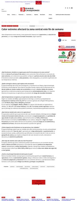 Altas temperaturas entre viernes y lunes generarían impactos en la agricultura, la salud de las personas y un mayor riesgo de incendios forestales, según expertos. ¿Qué fenómeno climático se espera para este fin de semana en la zona central? Entre el viernes 9 y el lunes 12 de enero, la zona central de Chile enfrentará un escenario de calor extremo, con condiciones que podrían configurar la primera ola de calor del año 2026.