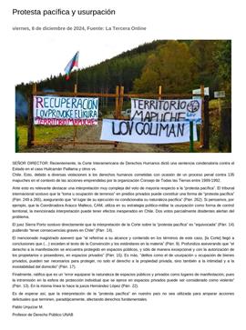 Protesta pacífica y usurpación 06-12-2024 La Tercera Online SEÑOR DIRECTOR: Recientemente, la Corte Interamericana de Derechos Humanos dictó una sentencia condenatoria contra el Estado en el caso Huilcamán Paillama y otros vs. Chile. Esto, debido a d... |