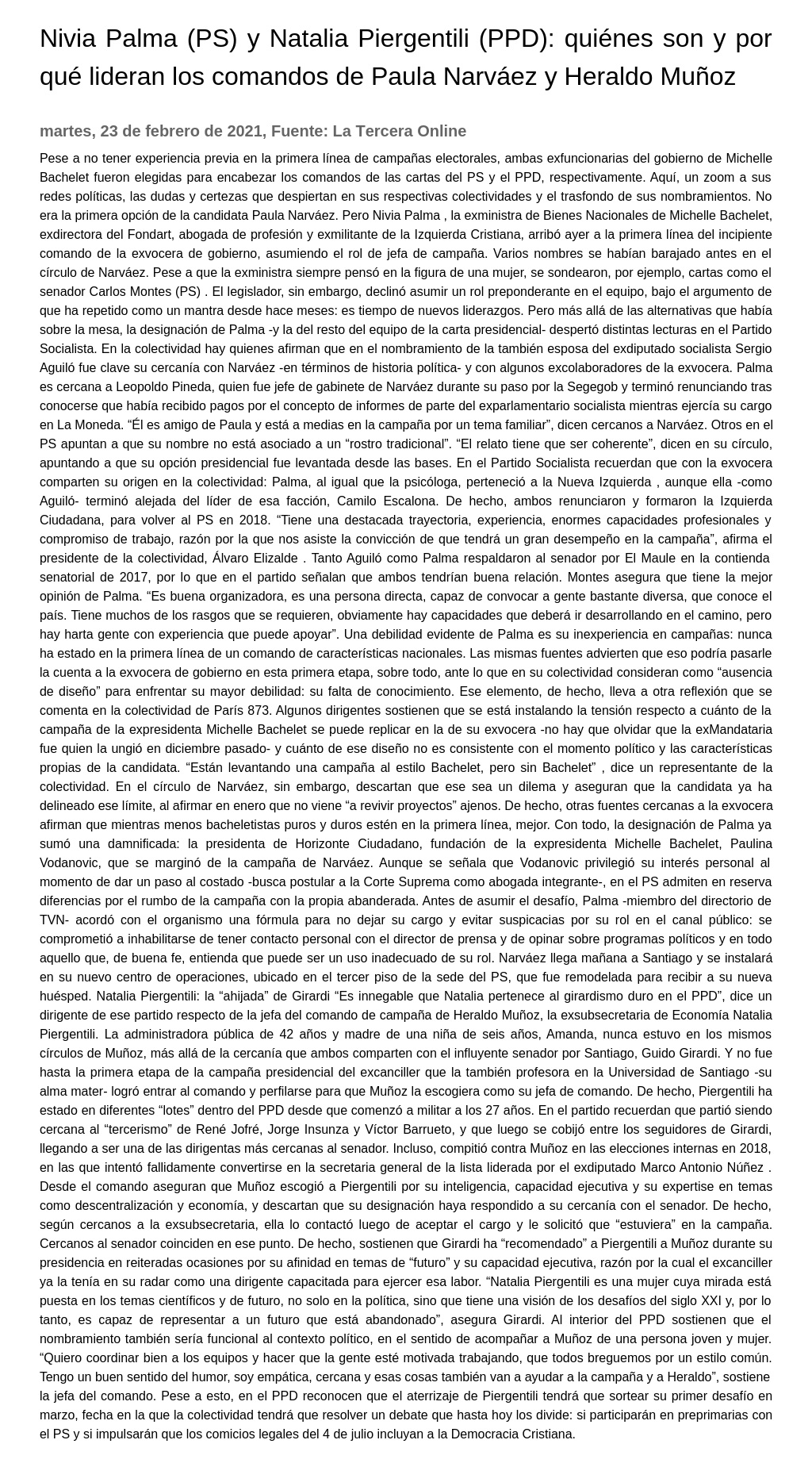 Pero Nivia Palma, la exministra de Bienes Nacionales de Michelle Bachelet, exdirectora del Fondart, abogada de profesión y exmilitante de la Izquierda Cristiana, arribó ayer a la primera línea del incipiente comando de la exvocera de gobierno, asumiendo el rol de jefa de campaña. Varios nombres se habían barajado antes en el círculo de Narváez.