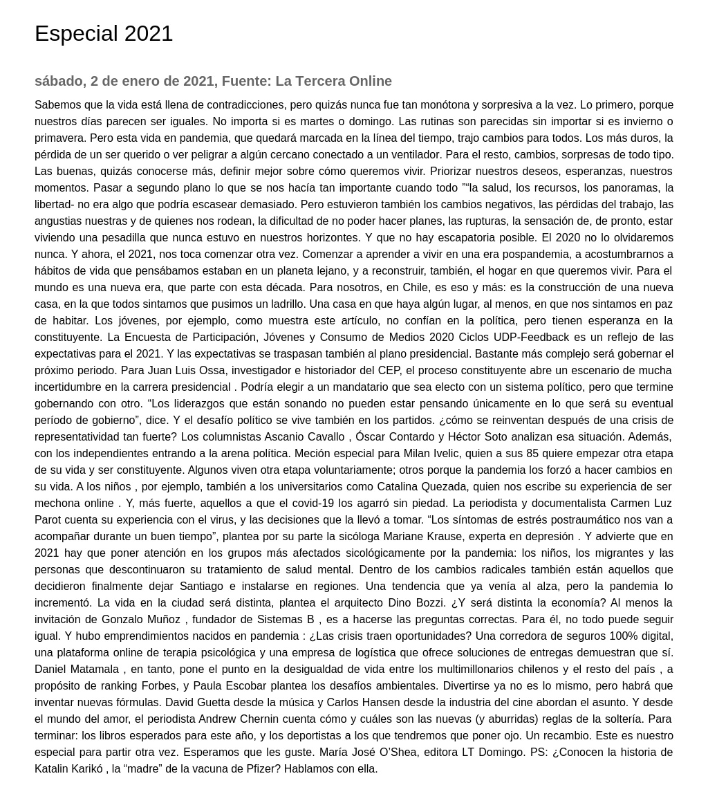 Y hubo emprendimientos nacidos en pandemia : ¿ Las crisis traen oportunidades? Una corredora de seguros 100% digital, una plataforma online de terapia psicológica y una empresa de logística que ofrece soluciones de entregas demuestran que sí. Daniel Matamala, en tanto, pone el punto en la desigualdad de vida entre los multimillonarios chilenos y el resto del país, a propósito de ranking Forbes, y Paula Escobar plantea los desafíos ambientales. Divertirse ya no es lo mismo, pero habrá que inventar nuevas fórmulas. David Guetta desde la música y Carlos Hansen desde la industria del cine abordan el asunto. Y desde el mundo del amor, el periodista Andrew Chernin cuenta cómo y cuáles son las nuevas (y aburridas) reglas de la soltería. Para terminar: los libros esperados para este año, y los deportistas a los que tendremos que poner ojo. Un recambio. Este es nuestro especial para partir otra vez. Esperamos que les guste. María José O’Shea, editora LT Domingo. PS: ¿ Conocen la historia de Katalin Karikó, la “madre” de la vacuna de Pfizer? Hablamos con ella.