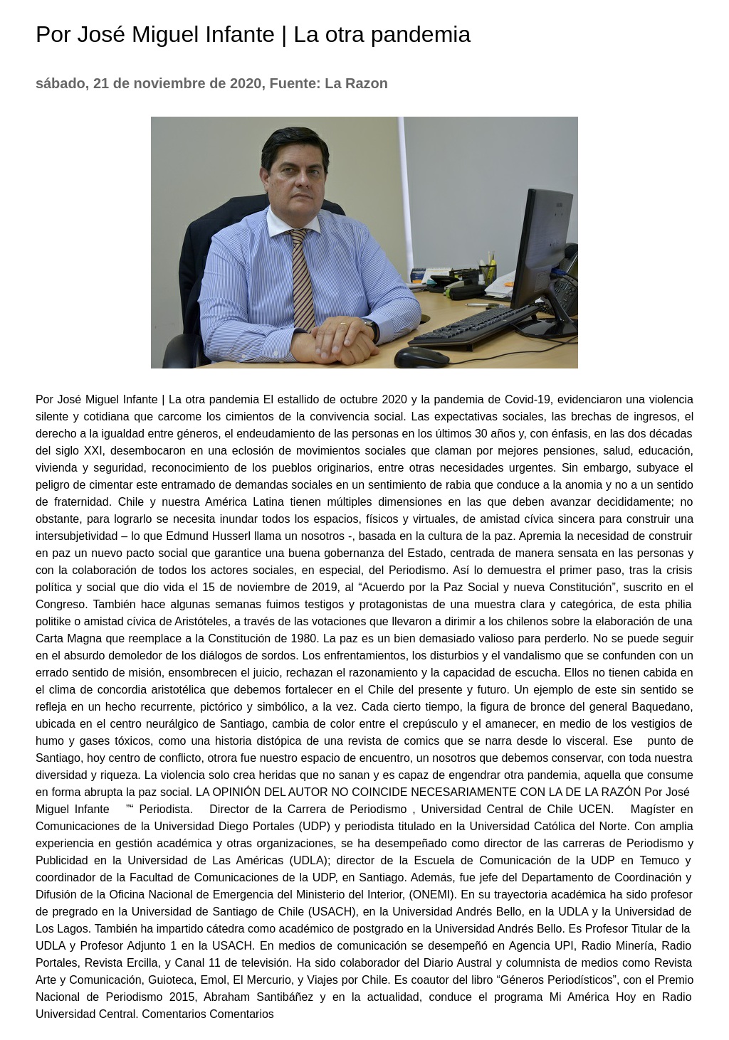 LA OPINIÓN DEL AUTOR NO COINCIDE NECESARIAMENTE CON LA DE LA RAZÓN Por José Miguel Infante ”“ Periodista. Director de la Carrera de Periodismo, Universidad Central de Chile UCEN. Magíster en Comunicaciones de la Universidad Diego Portales (UDP) y periodista titulado en la Universidad Católica del Norte.